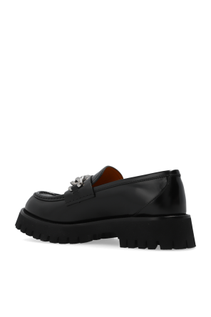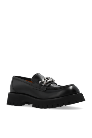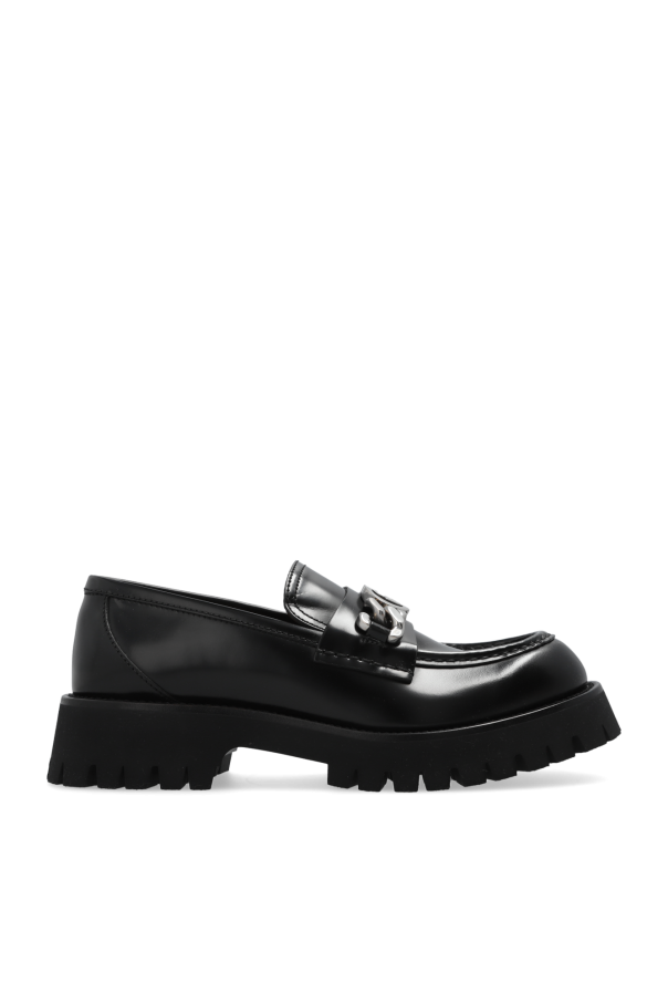 Gucci的黑色乐福鞋。采用光滑皮革制成。前部饰有银色装饰贴饰。黑色橡胶鞋底。