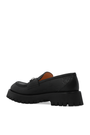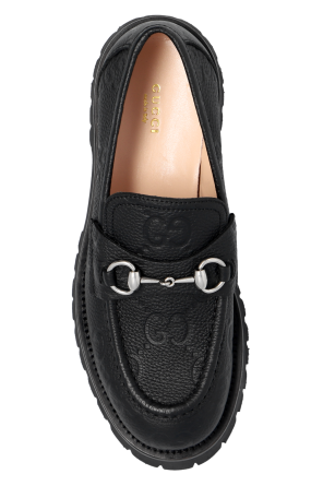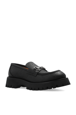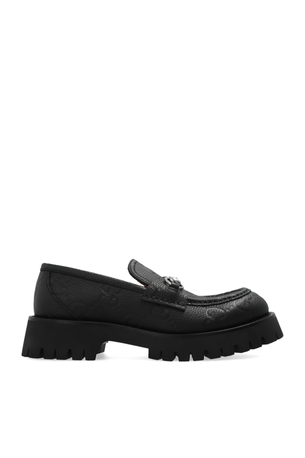 Gucci的黑色皮质乐福鞋。采用饰有GG压花图案的皮革制成。前部配有银色经典马勒。黑色橡胶鞋底。