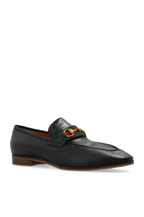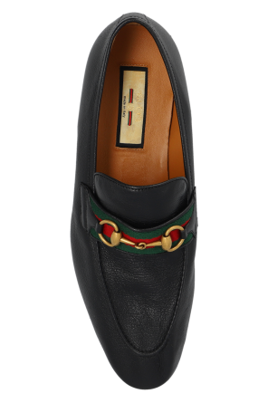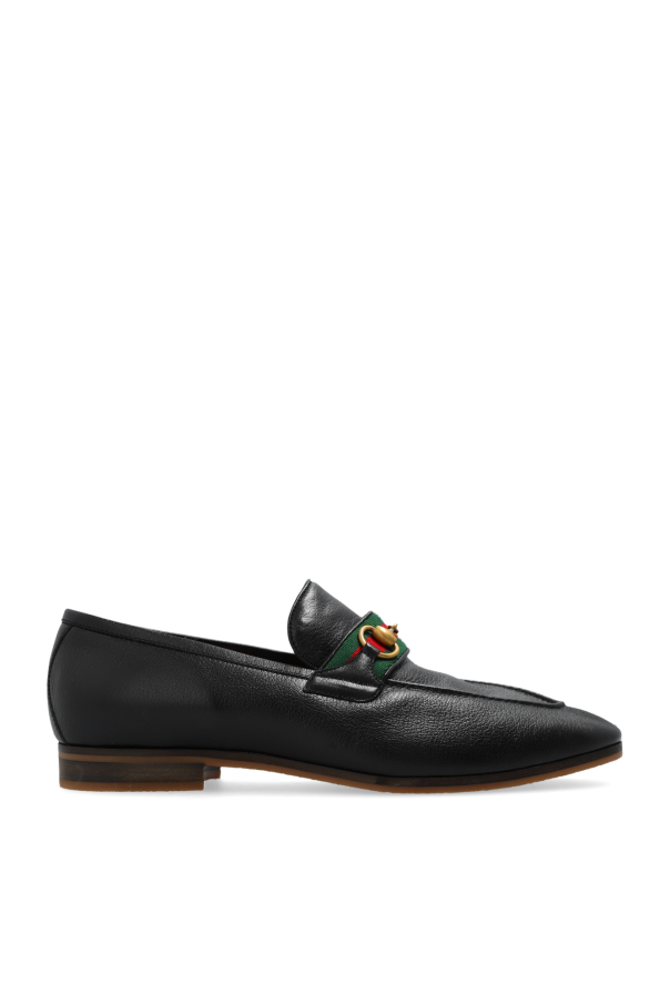 Gucci的黑色乐福鞋。采用皮革制作。前部饰有马衔金属饰片和绿红绿色Web细节皮带。浅棕色皮革鞋底。