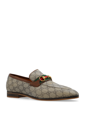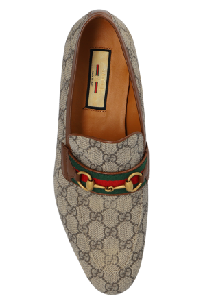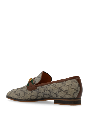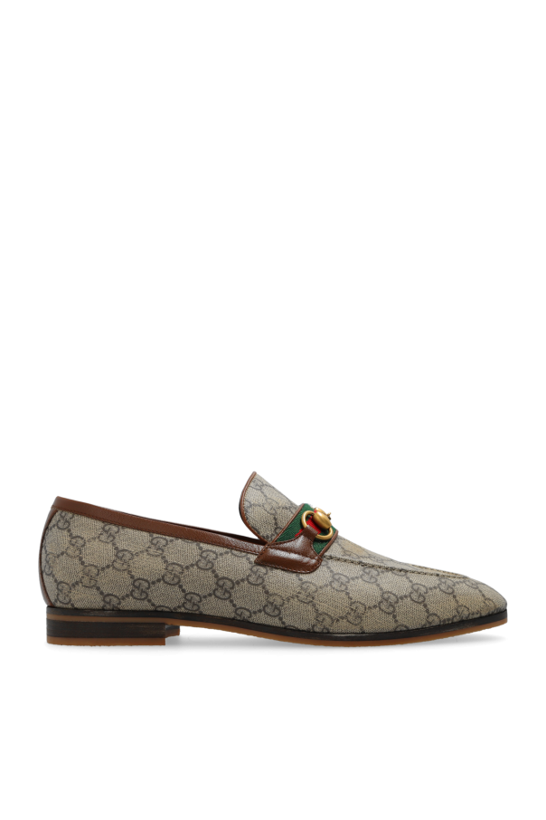 Gucci的米色和棕色乐福鞋。采用GG Supreme帆布制成,配以小牛皮饰边。饰有绿红绿色Web条纹细节和仿旧金色马衔扣。米色橡胶鞋底。