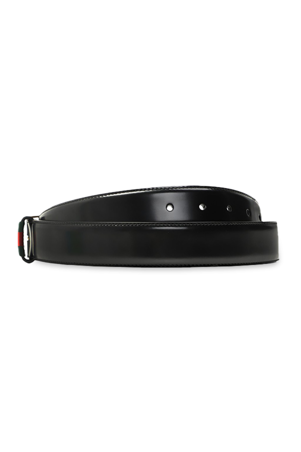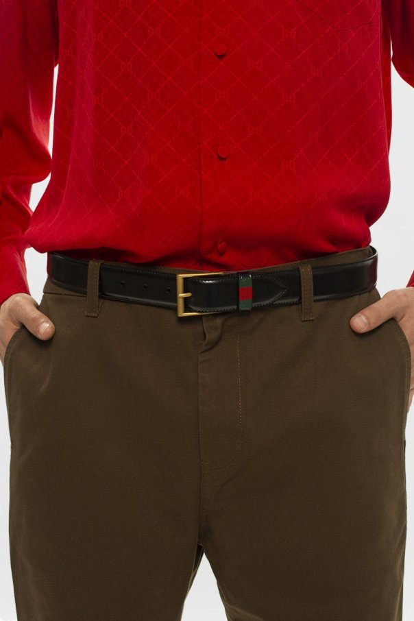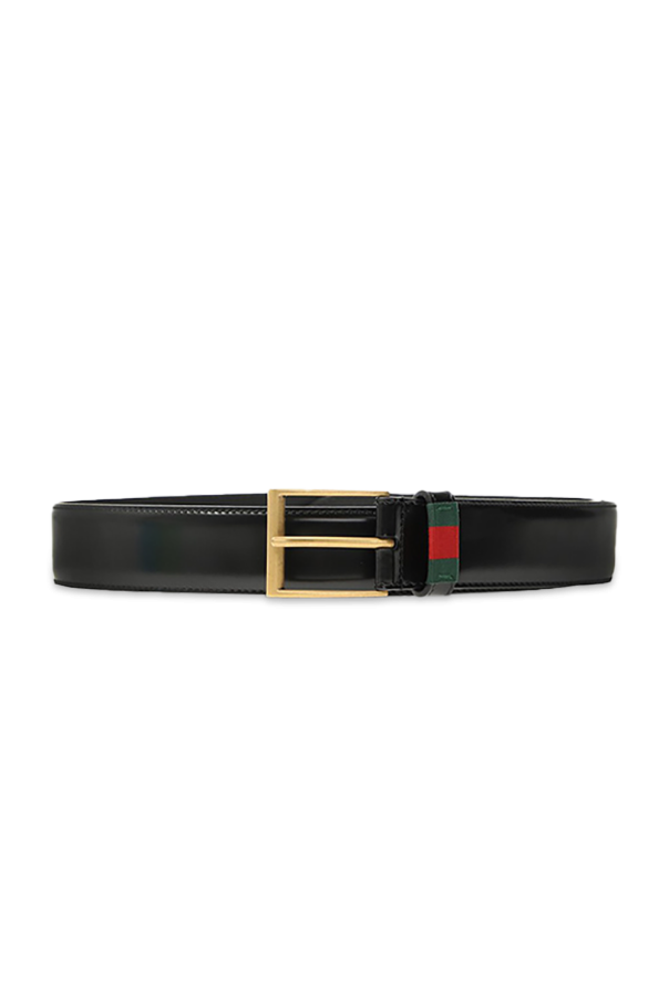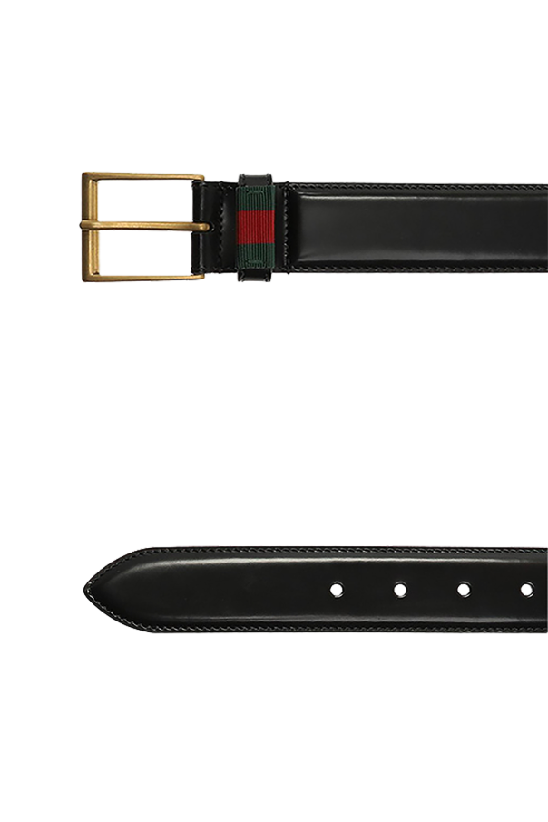 Gucci的黑色腰带。皮革制成。饰有绿色红色绿色的品牌标志性Web条纹。金色调金属配件。
