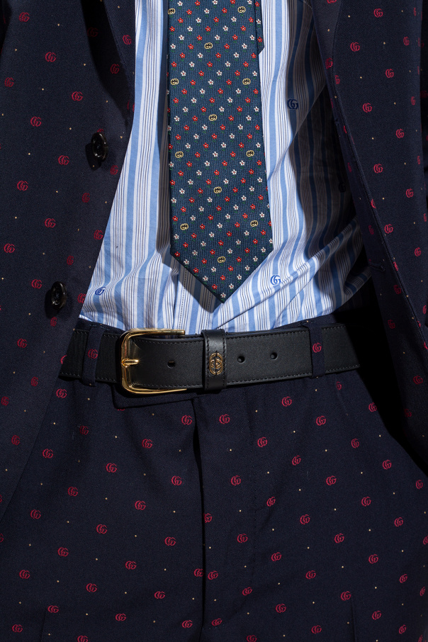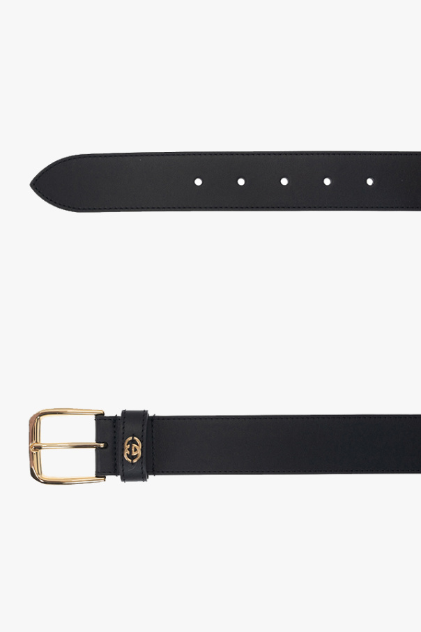 Gucci的黑色腰带,采用小牛皮制成,饰有字母组合贴花,并配有金色搭扣。