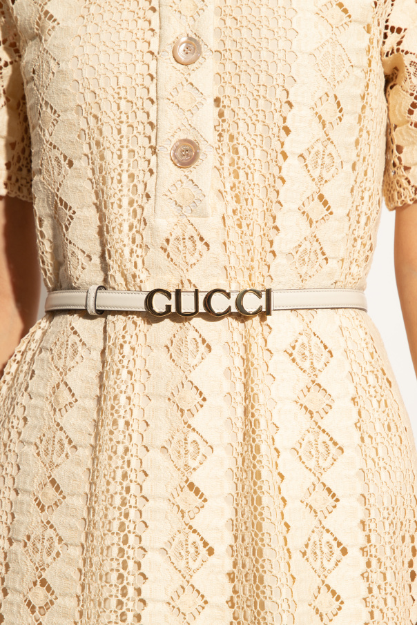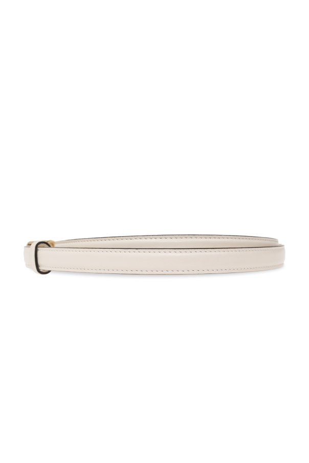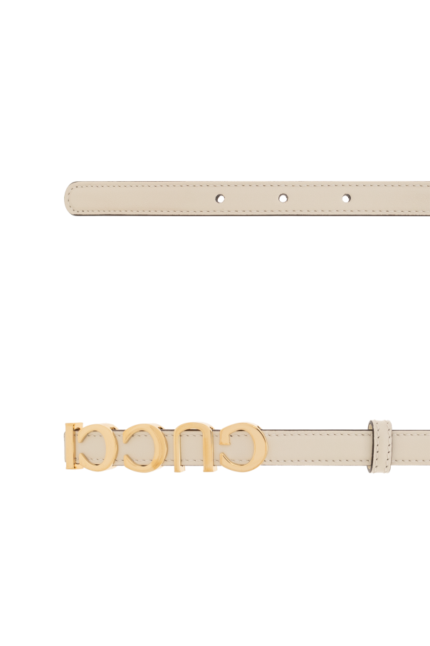 Gucci的奶油色腰带,采用小牛皮制成,配有徽标形状的装饰性金色搭扣。