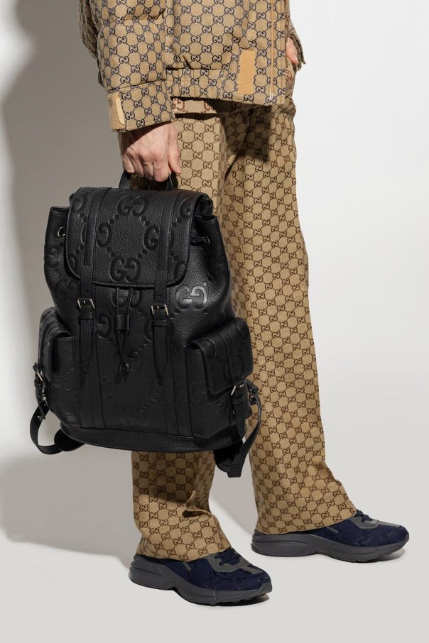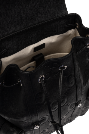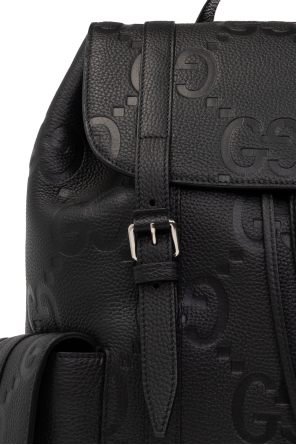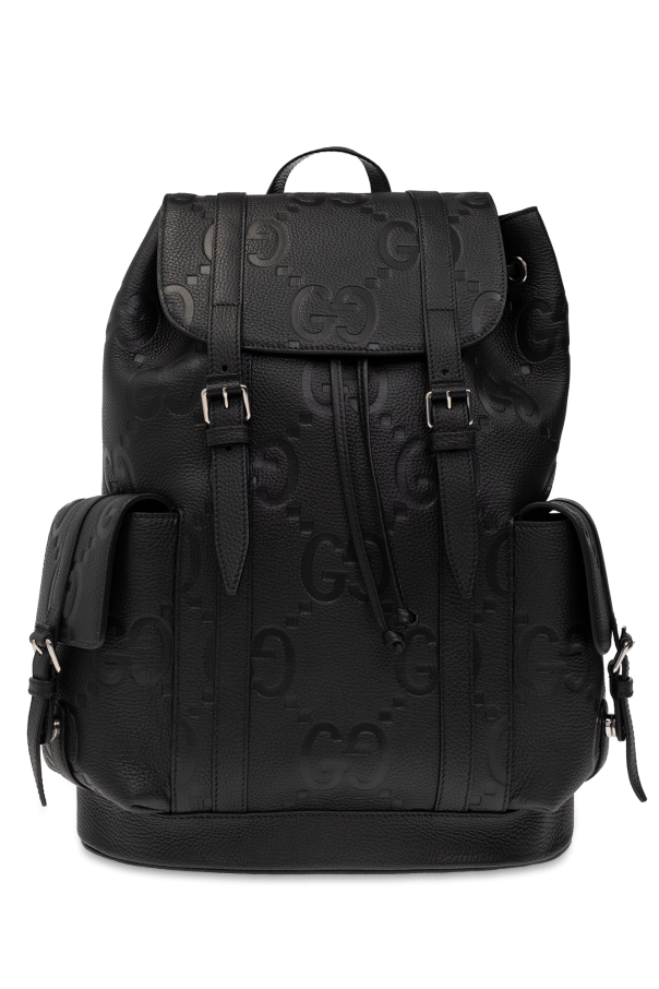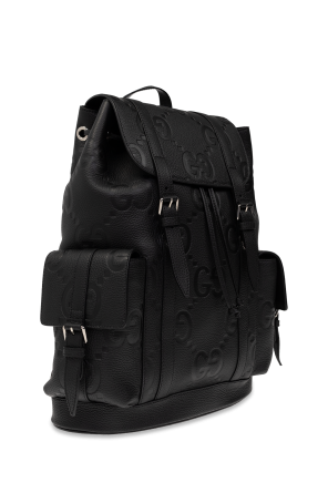 Black backpack from Gucci. Crafted from leather with an embossed Jumbo GG pattern, this model is complete with a flap pocket on the sides with buckle and snap fastening, half-round handle, adjustable shoulder straps, silver-tone metal hardware and one internal compartment with a laptop compartment.