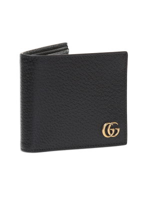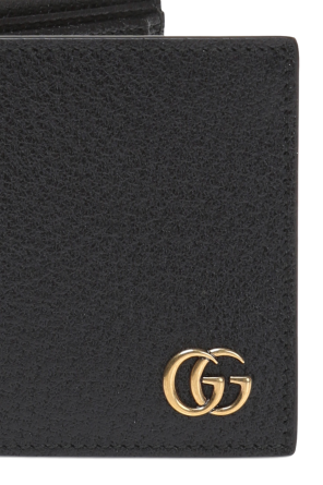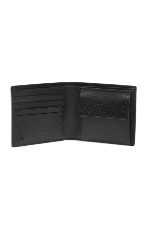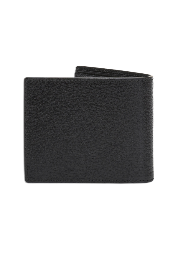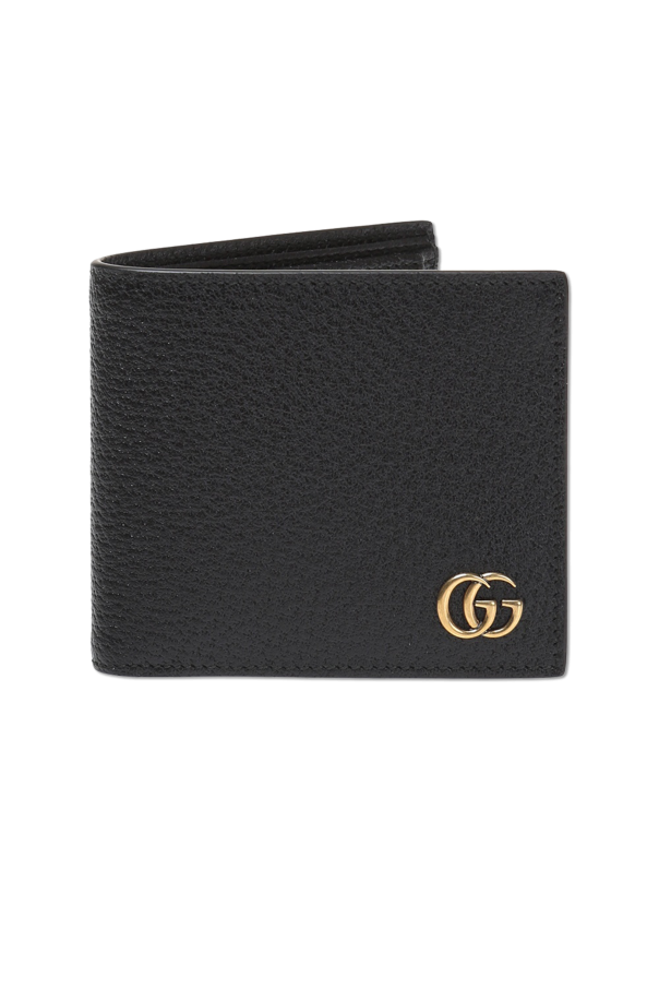 这款黑色对折钱包来自Gucci,采用粒面皮革制成,饰以做旧金色金属标牌。内有两个钞票位、一个拉链零钱袋、两个插袋与四个卡位。