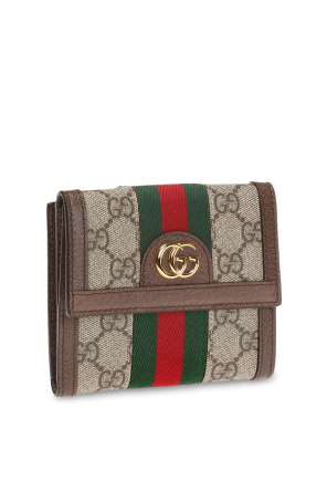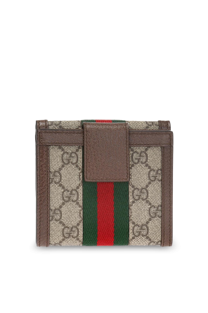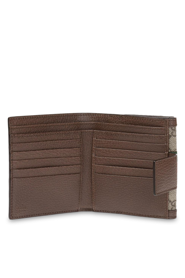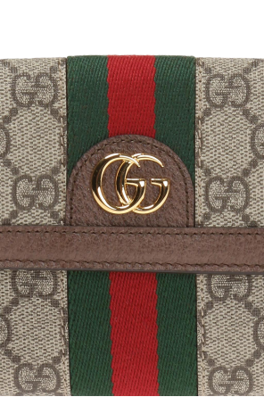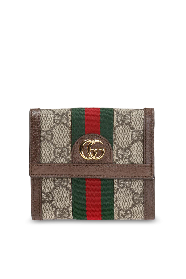 Gucci的棕米色钱包,饰以logo图案与红绿色Web条纹。