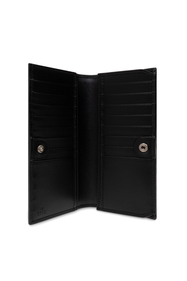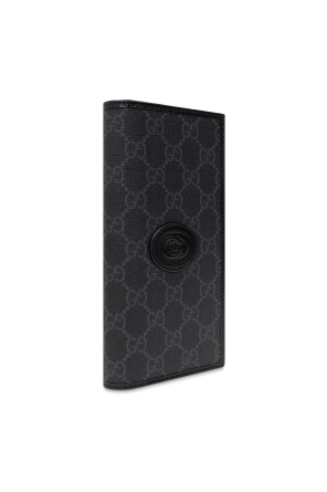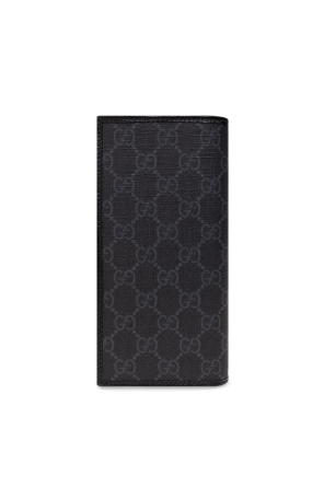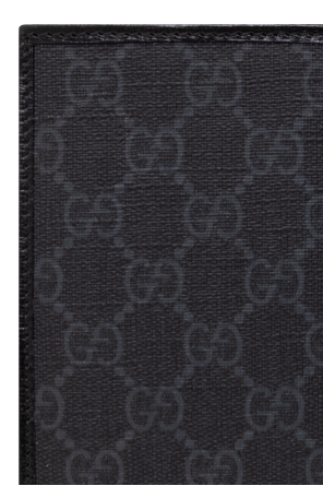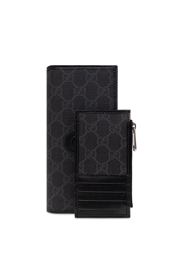 Gucci的黑色钱包和卡包套装。采用GG Supreme帆布和皮革制成。钱包采用按扣开合。正面饰有标志贴花。内部设有纸币夹层、三个插袋和十六个卡位。附带的卡包配有拉链口袋和九个卡位。