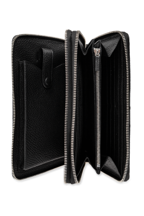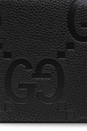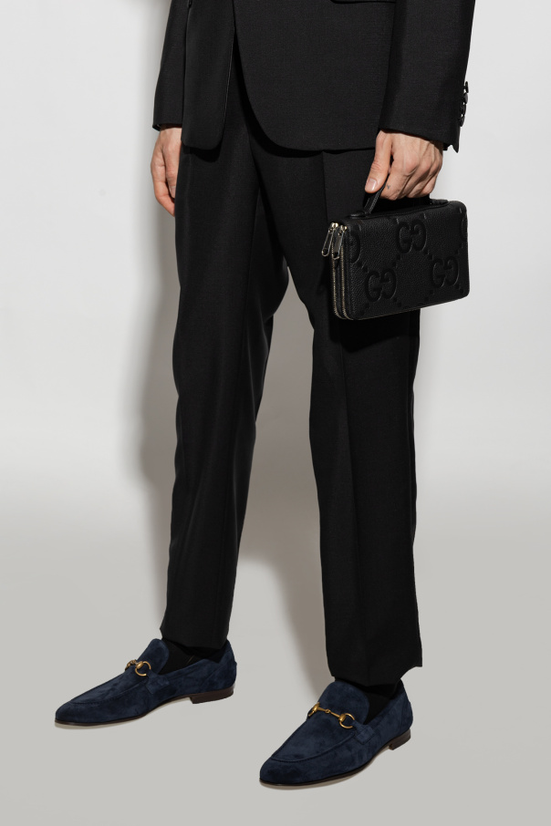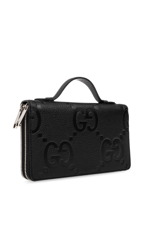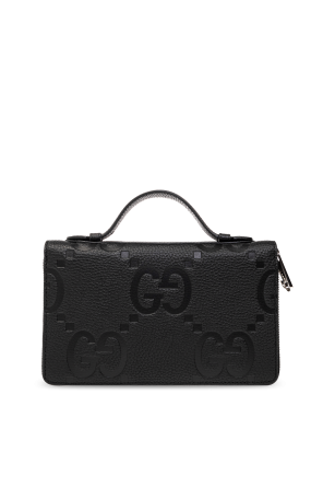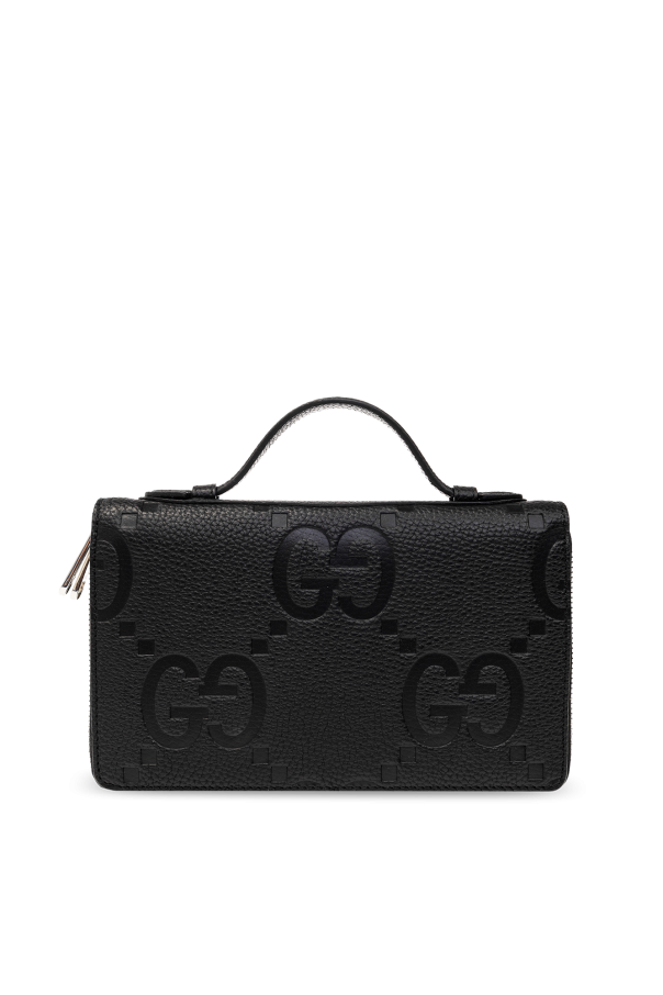 Black document case from Gucci. Made of leather with the iconic Jumbo GG pattern, this design features two separate internal compartments with zip-around fastening and silver-tone metal hardware. It has a snap-fastened coin pocket, two bill compartments, one zip pocket, five slip pockets and multiple card slots inside.