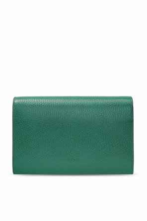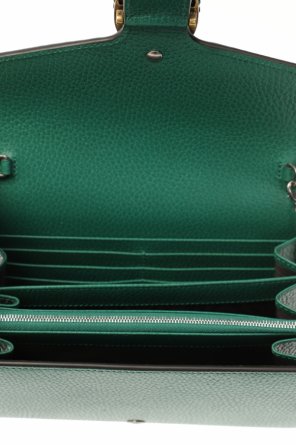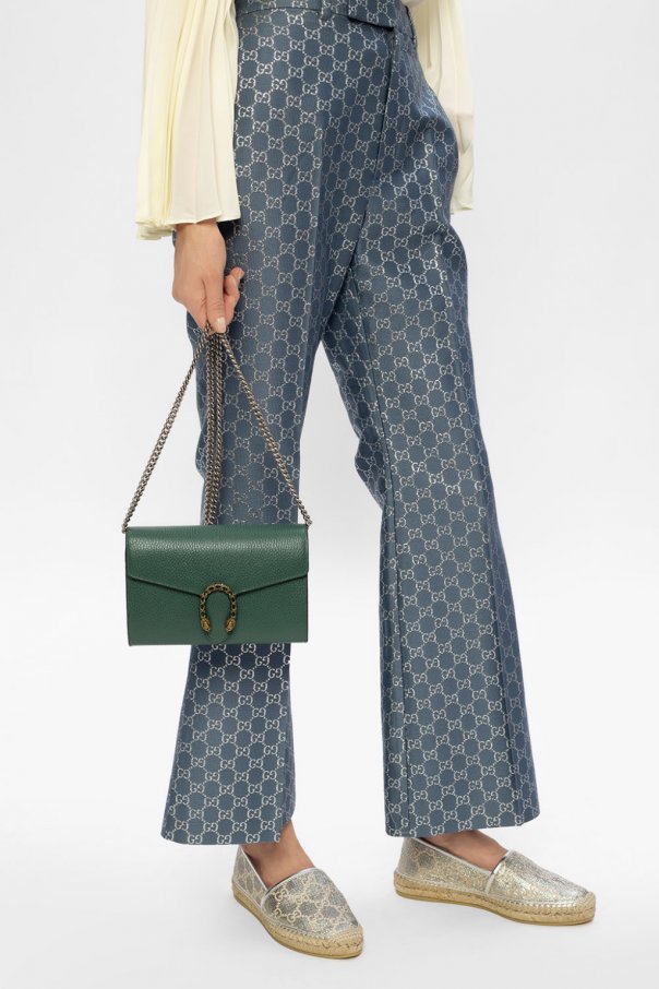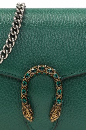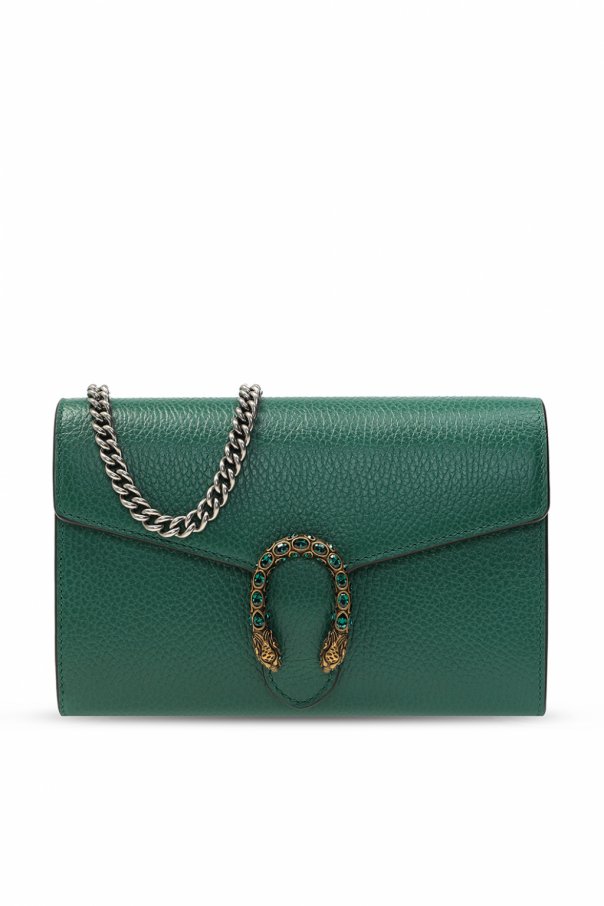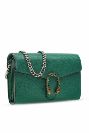 Gucci的绿色Dionysus单肩包。皮革制成。附磁性按扣。饰有虎头配件,含装饰元素。银色调可移动链式肩带。附四个隔层,其中一个隔层含拉链。另附两个插袋及十六个卡槽。