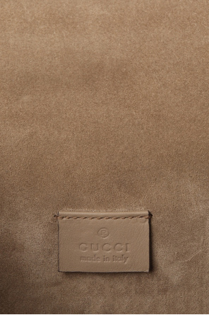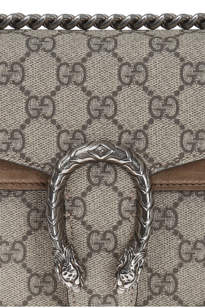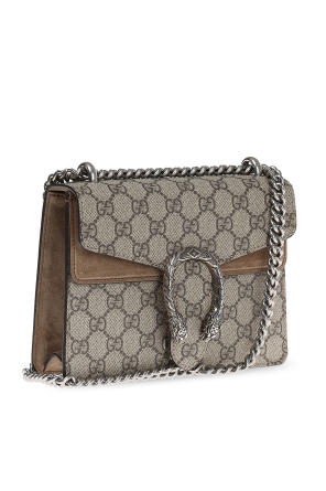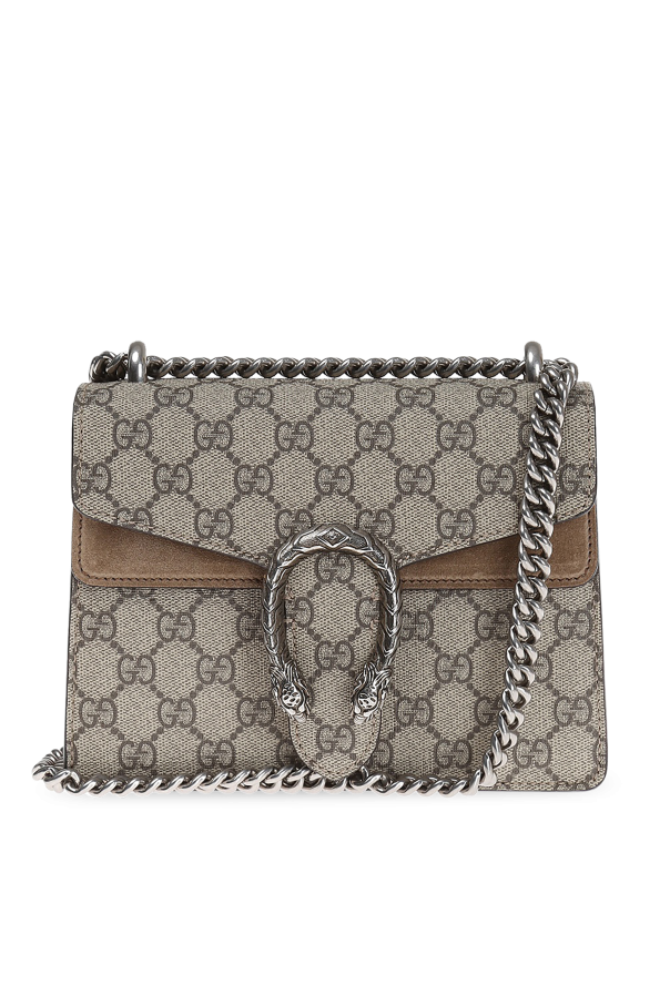 Gucci米色和棕色'Dionysus'单肩包采用'GG Supreme'帆布制成。麂皮。按扣。装饰金属扣与虎头印花。里面有带拉锁的口袋。长银色链带。