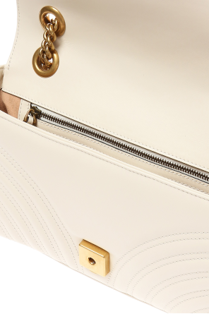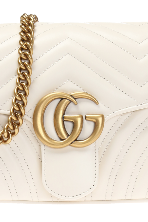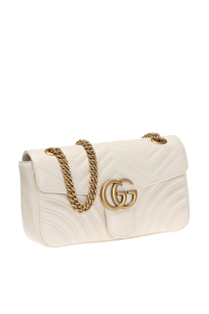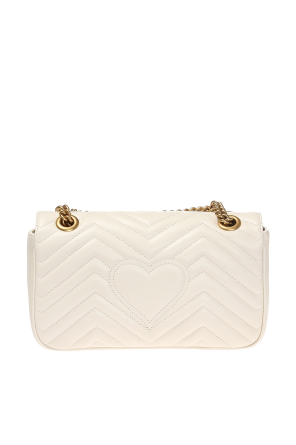 古驰(Gucci)'GG Marmont'款奶油色绗缝双肩包。皮革材质。金属开口。古铜金色品牌标志。背部饰有心形图案。链条肩带。内里