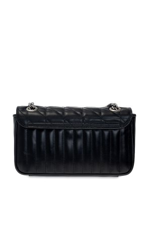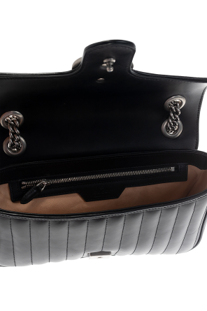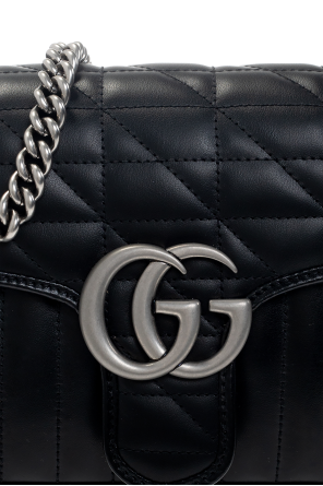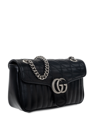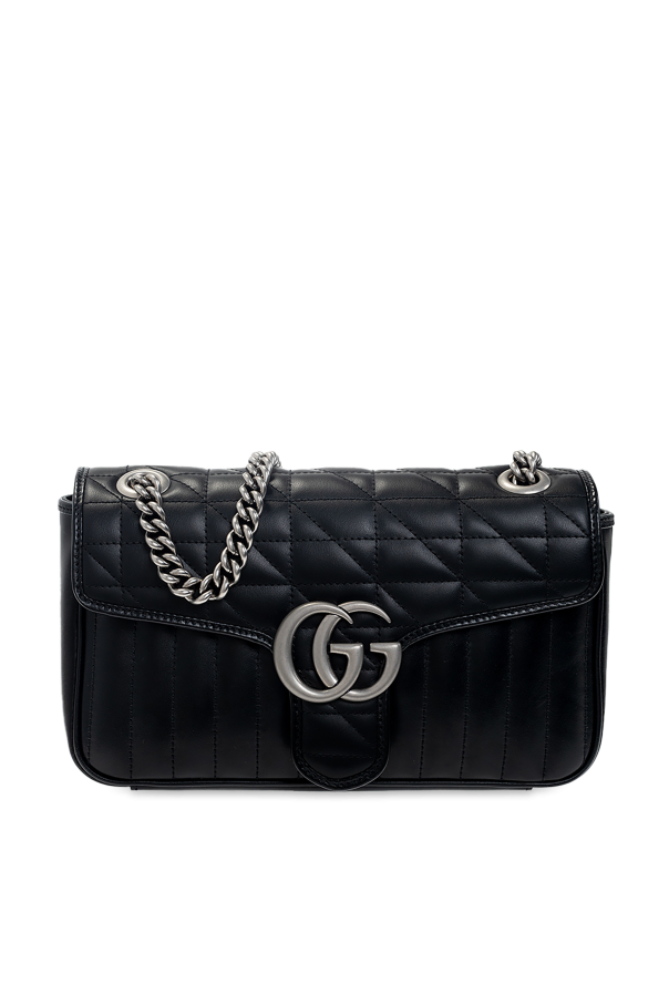 Gucci 黑色 'GG Marmont Small'绗缝单肩包。 这款款式采用小牛皮制成,采用装饰性搭扣固定,并饰有金属标志。 它配有链条肩带、银色金属配件和一个带米色衬里的内部隔层和一个拉链袋。