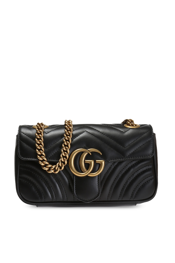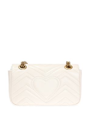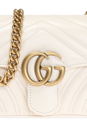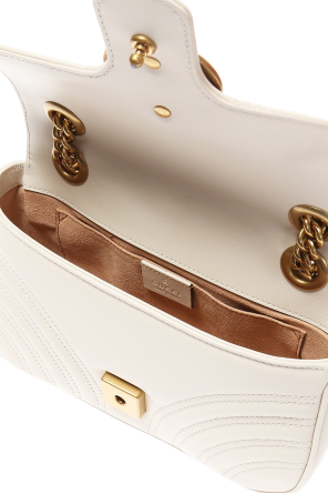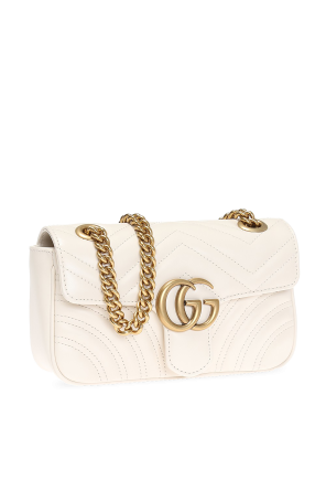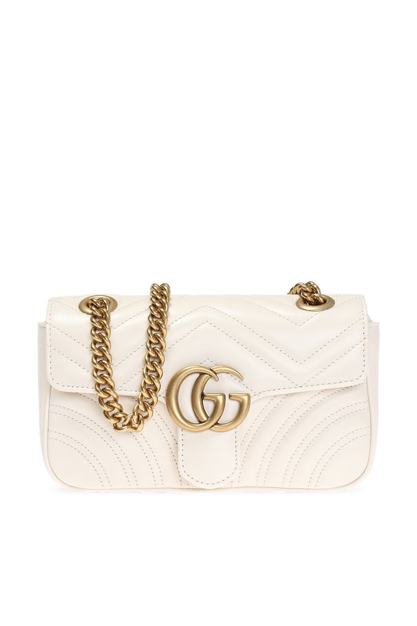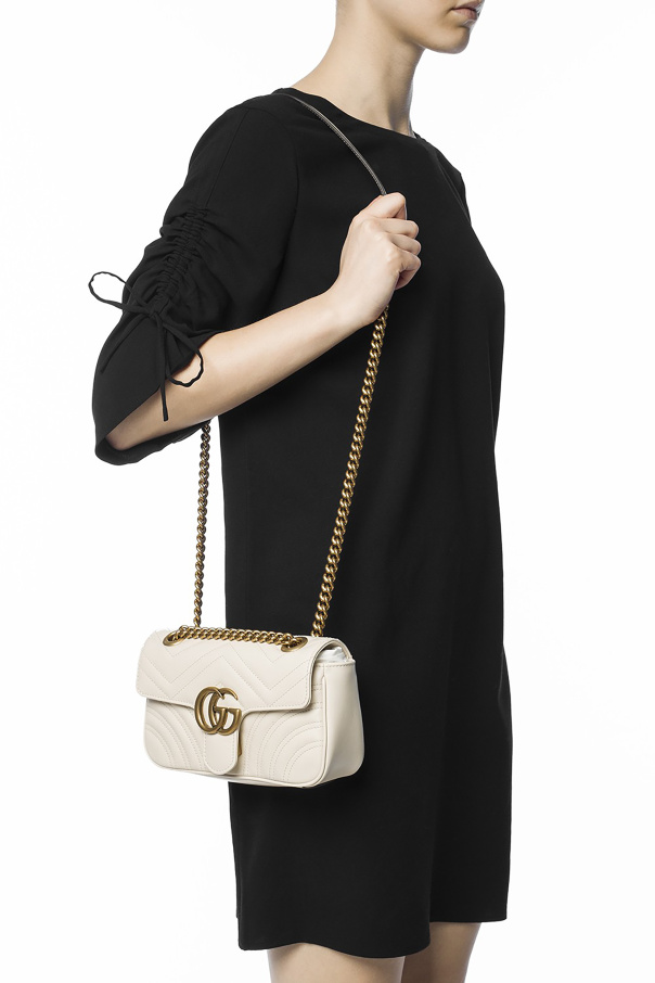 Gucci的奶油色GG Marmont单肩包。皮革制成。附按扣。 正面有金属徽标logo。 附链带。 浅米色衬里内部有一个口袋。 复古金色金属饰件。