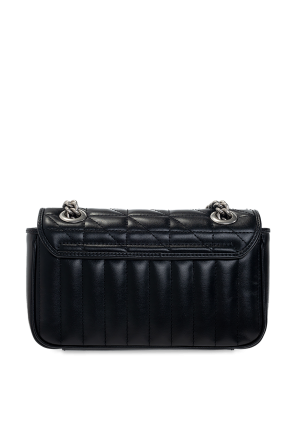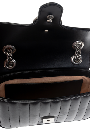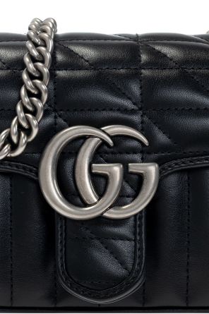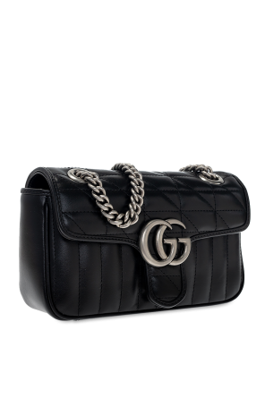 Gucci的黑色“GG Marmont Mini”绗缝单肩包。 这款款式采用小牛皮制成,采用装饰性搭扣固定,并饰有金属标志。 它配有链条肩带、银色金属配件和一个带米色衬里的内部隔层和一个插袋。
