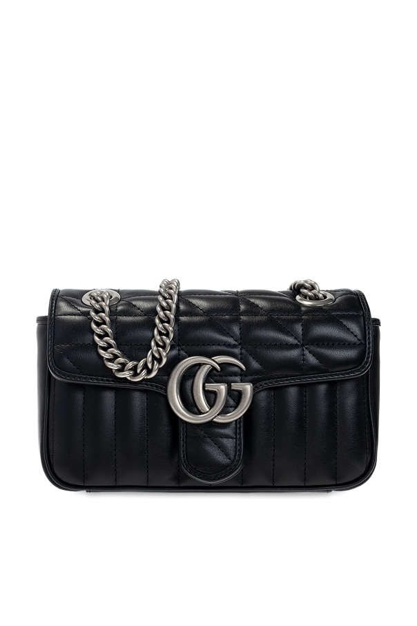 Gucci的灰色“GG Marmont Mini”绗缝单肩包。 这款款式采用小牛皮制成,采用装饰性搭扣固定,并饰有金属标志。 它配有链条肩带、银色金属配件和一个带米色衬里的内部隔层和一个插袋。