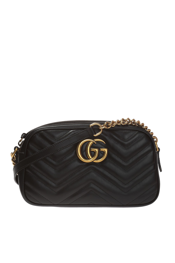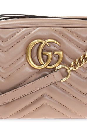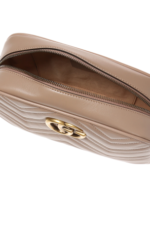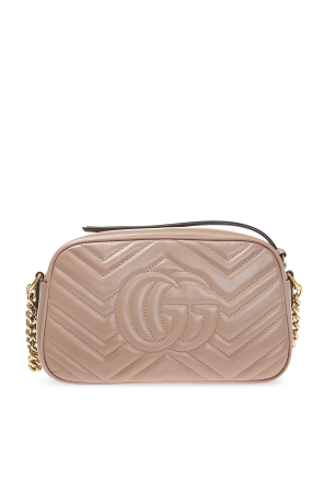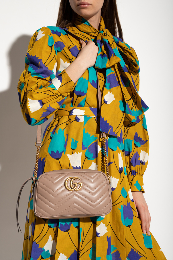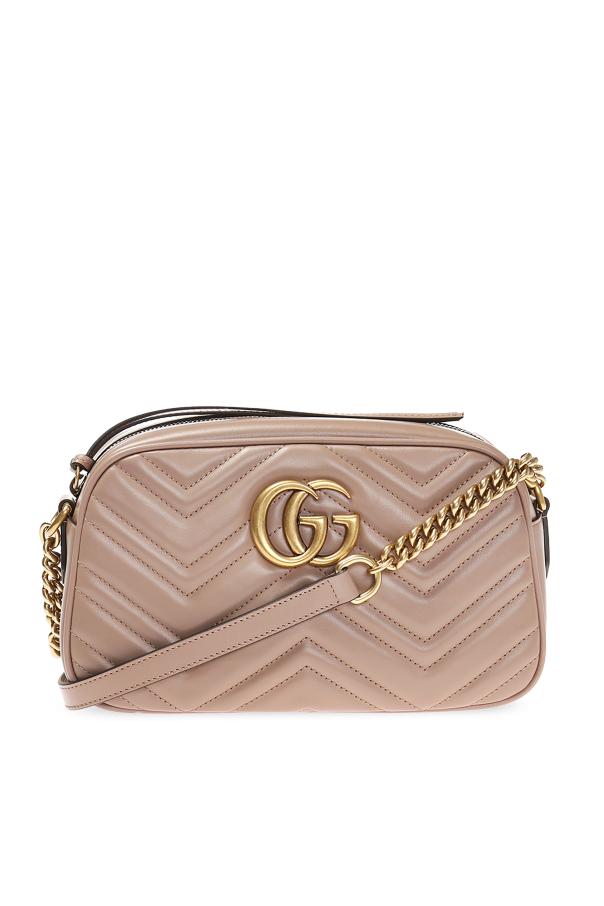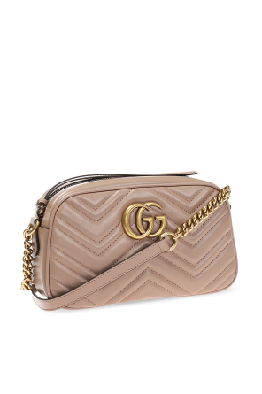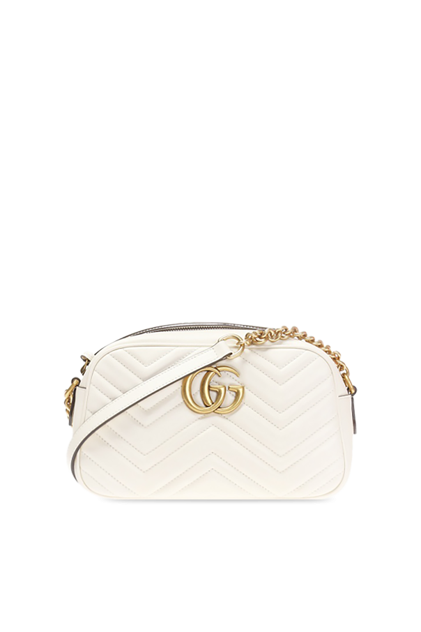这款米色真皮GG Marmont小号绗缝单肩包来自Gucci,饰以前置金属标识、后置刺绣标识、拉链开合、流苏拉片与皮质及链式可调肩带。内有一个主要分层和一个插袋。做旧金色金属配件。