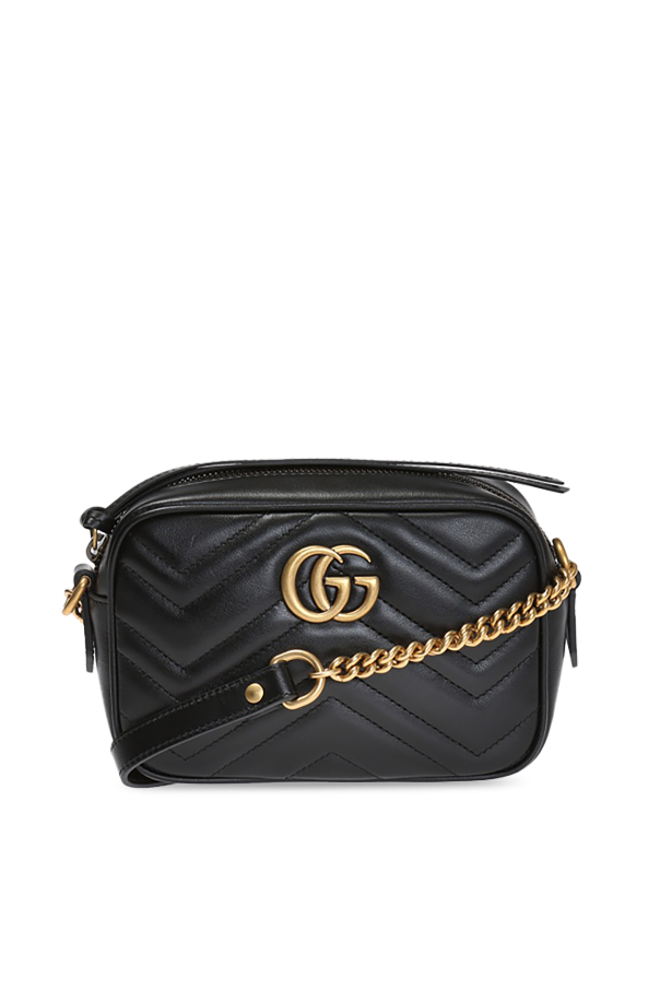 古驰(Gucci)米色 GG Marmont 夹棉挎包。皮革制造。滑扣合口。正面有金属标识。米色衬里内带1只滑袋。复古金质金属配件。