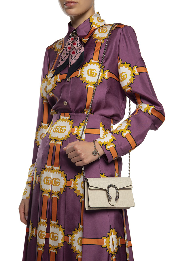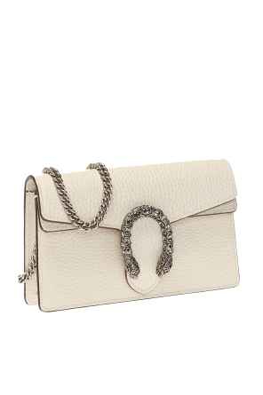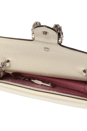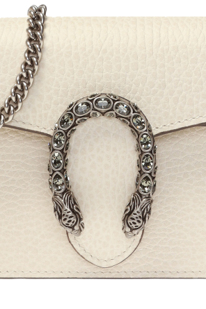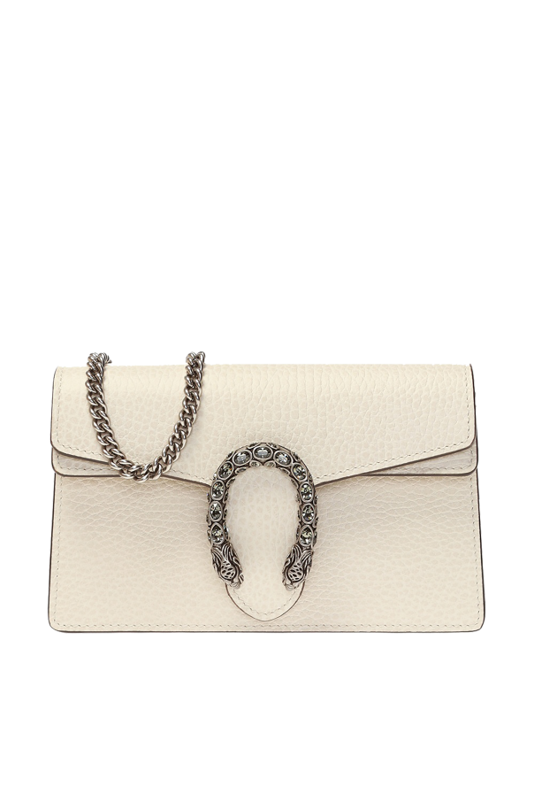 Gucci的奶油色Dionysus单肩包,超迷你款,采用纹理皮革制成,饰以施华洛世奇水晶镶嵌的贴饰,配有按扣开合、链式肩带、粉色内衬。内有一个主要分层、一个口袋。