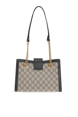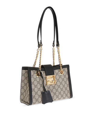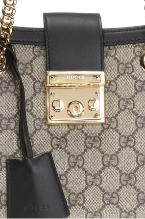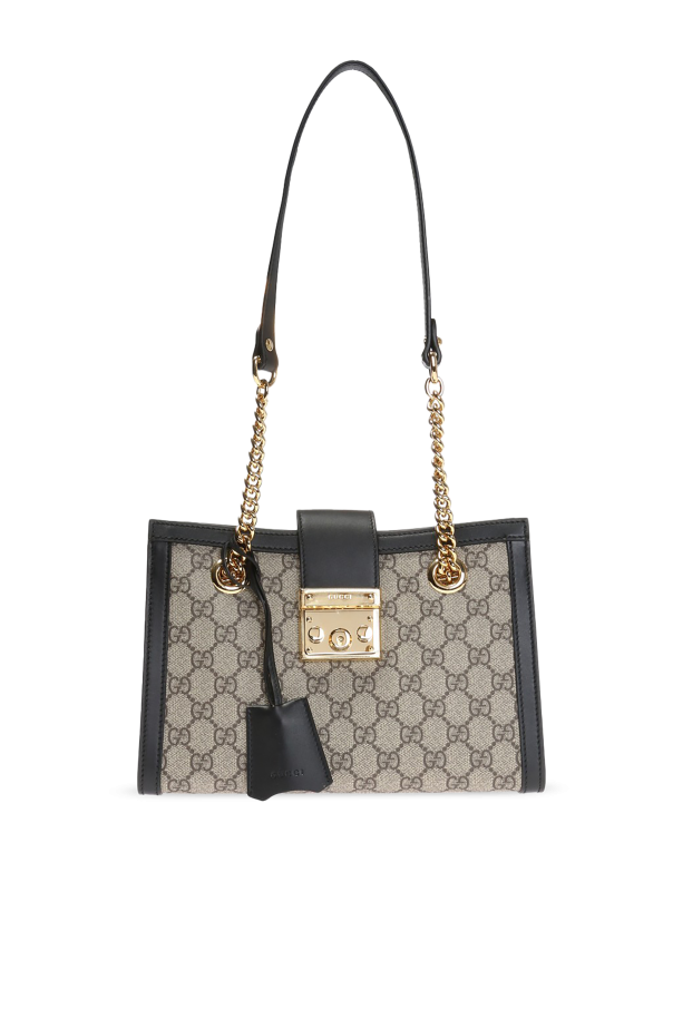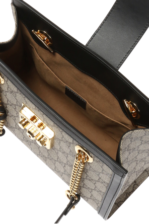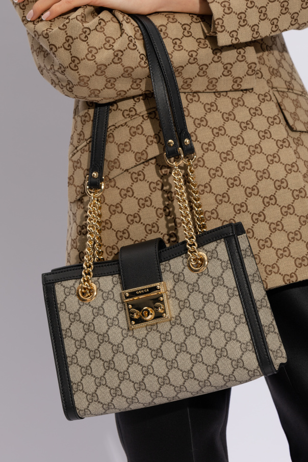 Gucci的棕色和黑色'Padlock'单肩包。 由“ GG Supreme”帆布制成,饰有光滑皮革。 附带logo标志的金属按扣。 侧面有装饰性配件。 链上有2个半圆形手柄。 棕色衬里内部有2个口袋。 金色金属硬件。