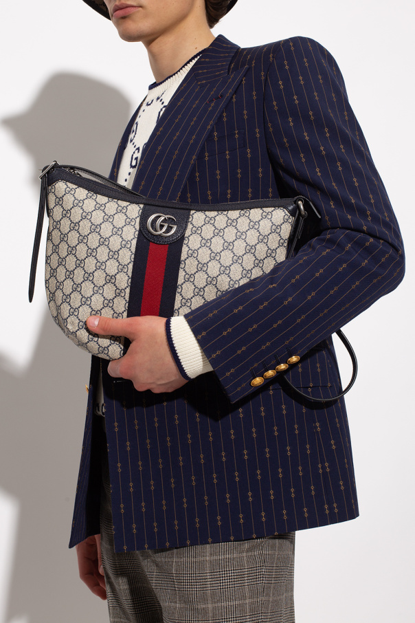 Cream and navy blue ‘Ophidia Small’ shoulder bag from Gucci. Crafted from GG Supreme canvas and trimmed with leather, this design secures with a zip and features navy blue and red Web stripe detailing, Double G hardware, an adjustable shoulder strap, antiqued silver-tone metal elements and one internal compartment with a zip pocket.