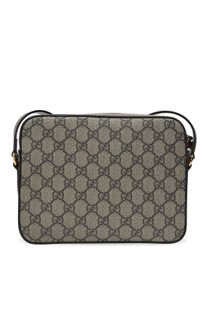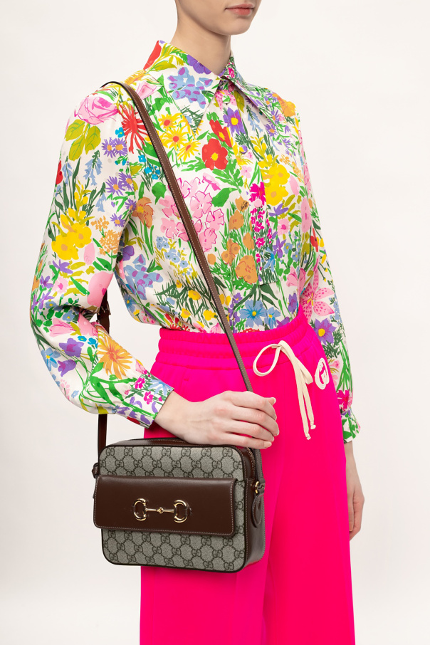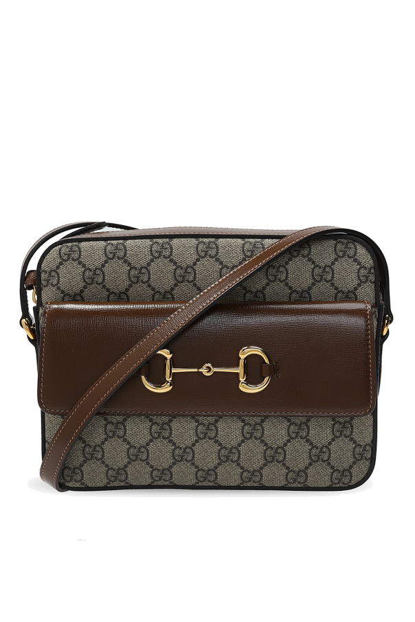 Gucci的米色及棕色Horsebit 1955单肩包。小号。GG Supreme帆布及棕色皮革质。饰有拉链。附金属质horsebit样式。正面饰有翻盖袋。可调节肩带。金色调金属配件。米色衬里。内部附一个隔层及一个拉链袋。
