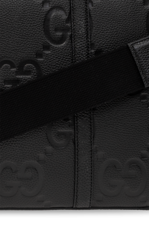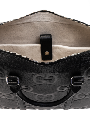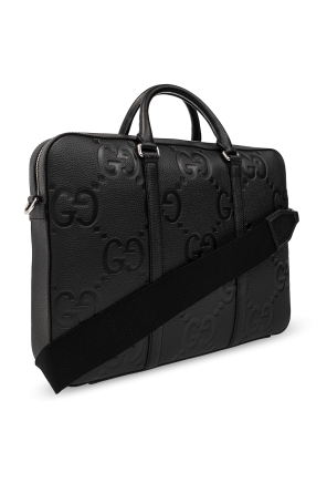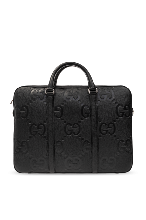 Black briefcase from Gucci. Crafted from leather with an embossed Jumbo GG pattern, this model is complete with a two-way zip, two half-round handles, detachable and adjustable shoulder strap, silver-tone metal hardware and one internal compartment with one snap-fastened pocket and one zip pocket.