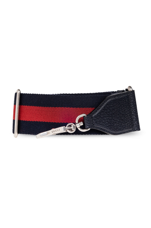 Cream and navy blue ‘1955 Horsebit Mini’ shoulder bag from Gucci. Crafted from canvas with an all-over jacquard GG monogram, this design features a magnetic fastener, leather trims, the brand's signature horsebit hardware on the front, two detachable and adjustable shoulder straps (a thin leather one and a nylon one in navy blue and red Web motif), silver-tone metal elements and one internal compartment.