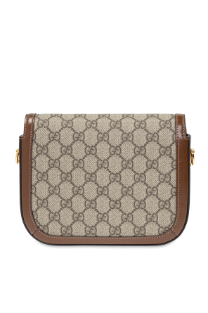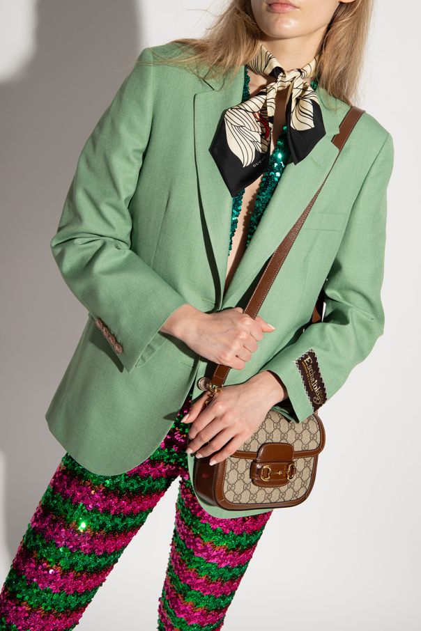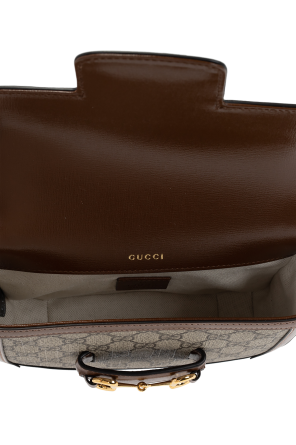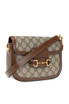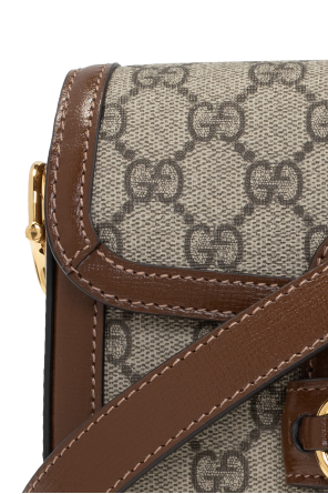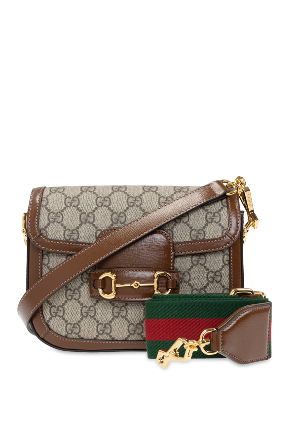 Gucci的棕米色Horsebit 1955单肩包,迷你号,采用标志性的GG Supreme帆布与皮革制成,饰以马衔扣贴饰。可拆卸可调双肩带,一条缀以标志性的绿红色Web条纹。金色金属配件。