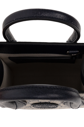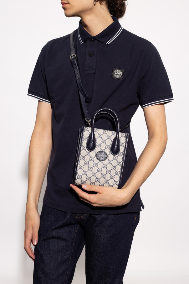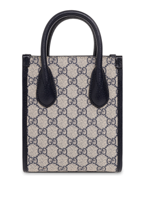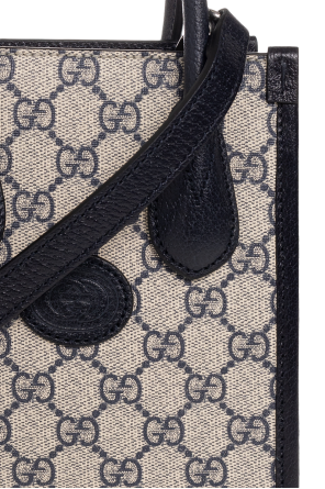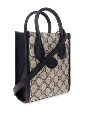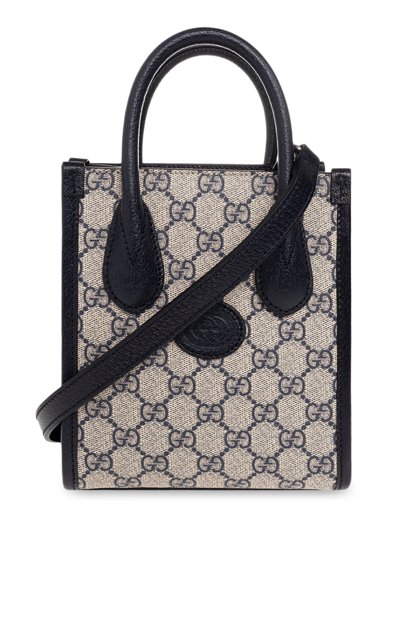 Cream and navy blue shoulder bag from Gucci. Crafted from the brand's signature monogrammed GG Supreme canvas and trimmed with leather, this design features a leather patch with an embossed Interlocking G logo on the front, two rigid handles, a detachable and adjustable shoulder strap, silver-tone metal hardware and one internal compartment with a card slot.