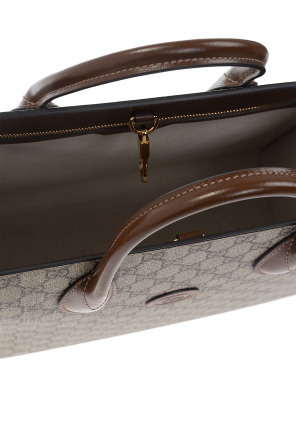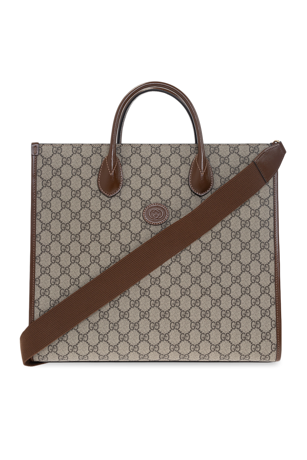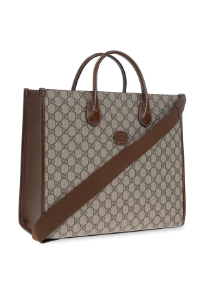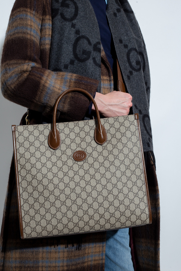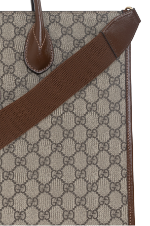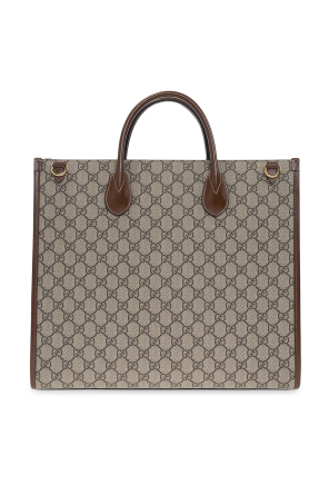 Beige and brown ‘GG Retro’ shopper bag from Gucci. Crafted from GG Supreme canvas with brown leather trims, this model features a magnetic gold-tone closure, logo detail, two half-round handles, detachable and adjustable strap and one internal compartment with one zip pocket.