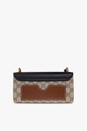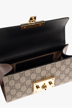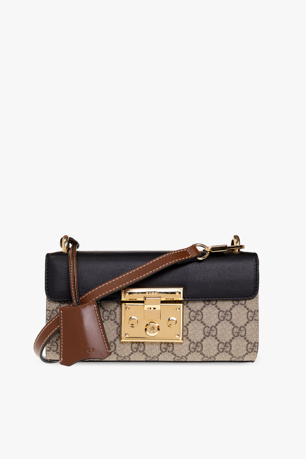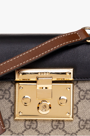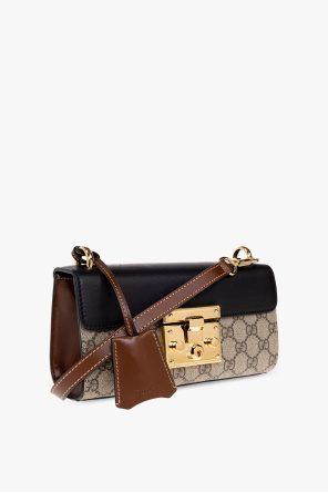 Beige, brown and black ‘Padlock Mini’ shoulder bag from Gucci. Crafted from GG Supreme canvas with calf leather trims, this model features a logo-engraved metal closure, back pocket, detachable charm with concealed keys, detachable shoulder chain, gold-tone metal hardware and one internal compartment with one card slot.
