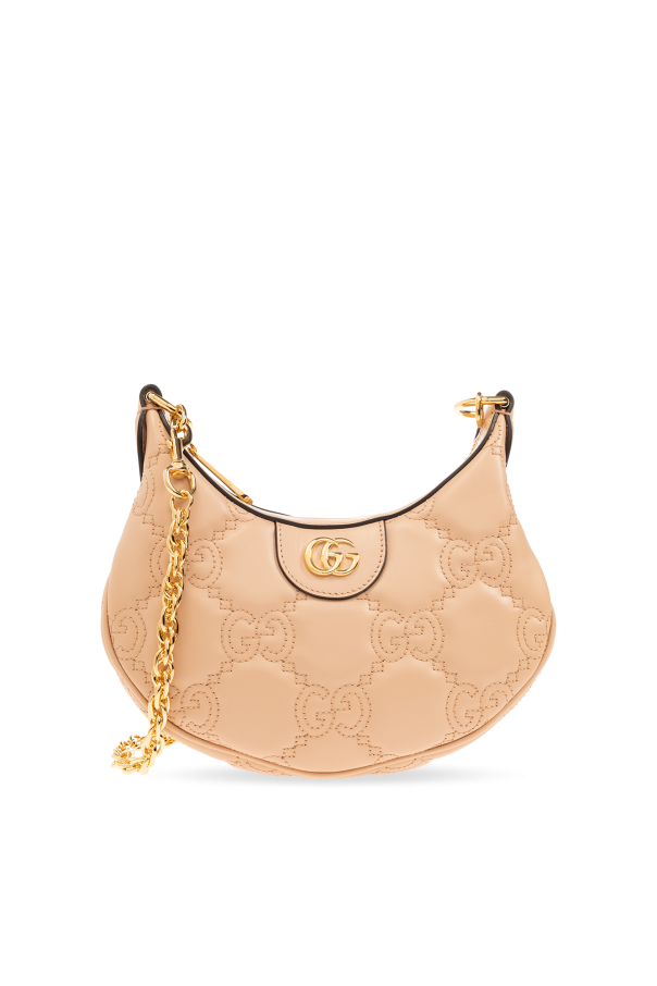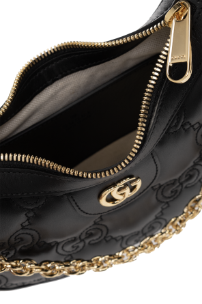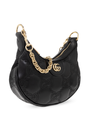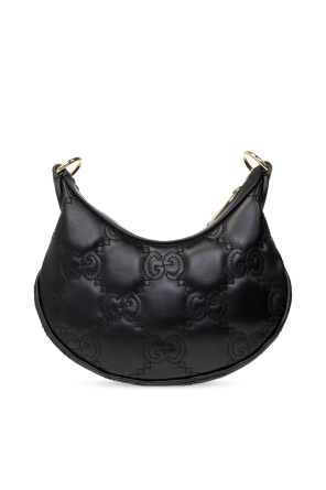 Black shoulder bag from Gucci. Crafted from calf leather, this design secures with a zip and showcases monogram quilting and ‘Double G’ hardware on the front. It is complete with a detachable chain and adjustable strap, gold-tone metal elements and one internal compartment with a slip pocket.