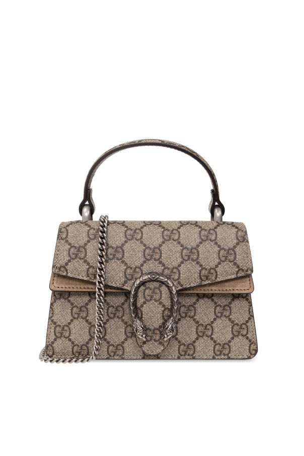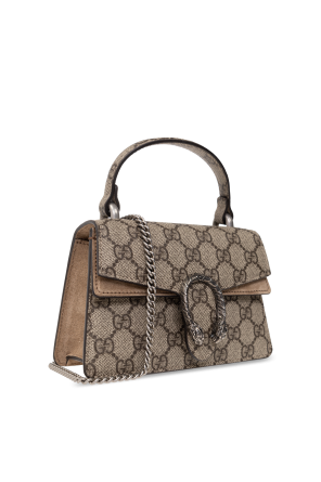 Beige and brown ‘Dionysus Mini’ shoulder bag from Gucci. Crafted from ‘GG Supreme’ canvas and trimmed with calf suede, this design secures with a snap featuring a signature tiger head plaque and employs a detachable chain shoulder strap, one half-round handle, antiqued silver-tone metal elements and one flapped pocket and one compartment inside.