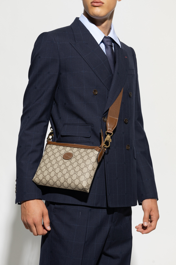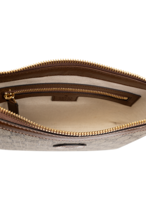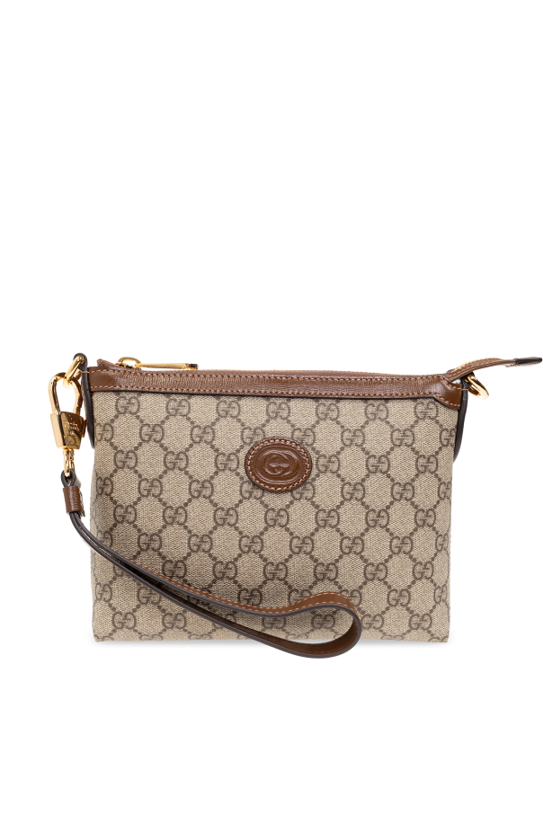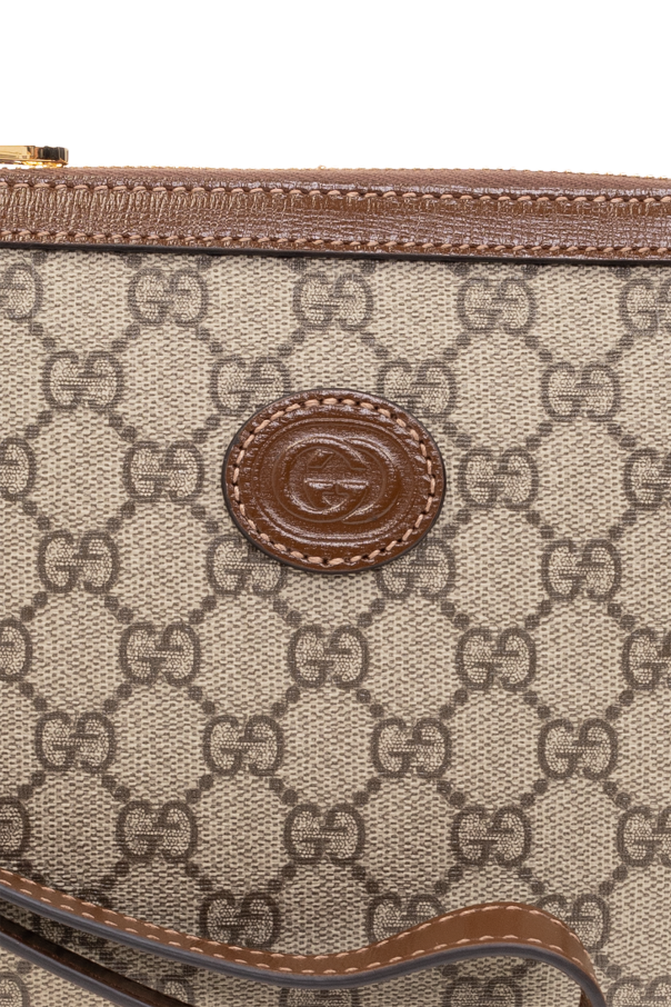Gucci的米色和棕色单肩包。采用GG Supreme帆布和小牛皮制成。拉链开合。正面饰有压花标志贴花。可拆卸的可调肩带和手腕带。内部设有带拉链口袋的主隔层。金色金属配件。