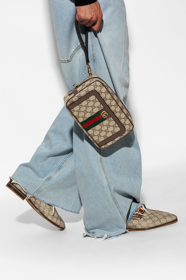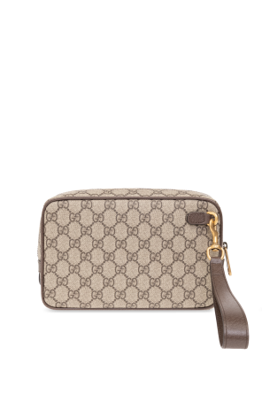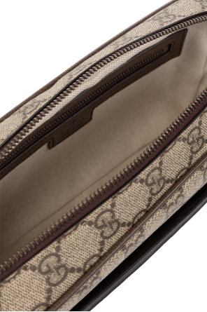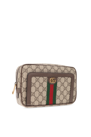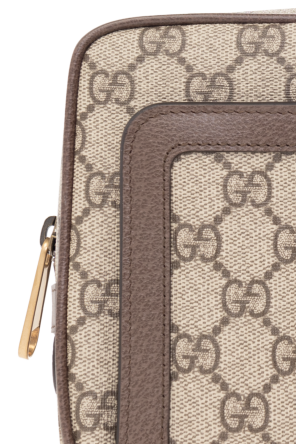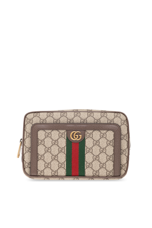 Beige and brown ‘Ophidia’ handbag from Gucci. Crafted from ‘GG Supreme’ canvas and trimmed with calf leather, this design secures with a zip and showcases green and red Web stripe detailing and ‘Double G’ hardware. It is complete with a detachable wrist strap, flap with magnetic snaps with four card slots on the front, antiqued gold-tone metal hardware and one internal compartment with a zip pocket.