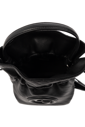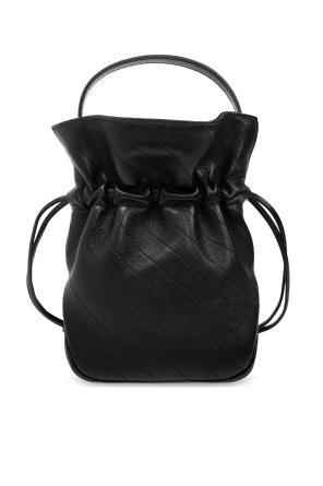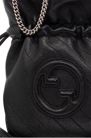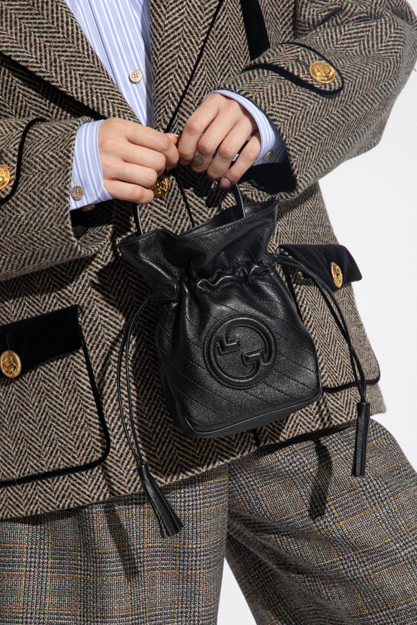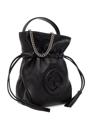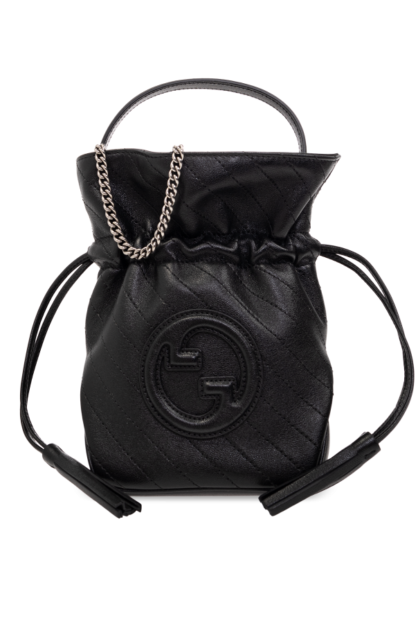 Gucci的Blondie Mini黑色水桶包,绗缝效果。抽绳开合,配有流苏饰。正面饰有Interlocking G标志贴花。半圆形提手和可拆卸链条肩带。内部设有一个主隔层。银色金属配件。