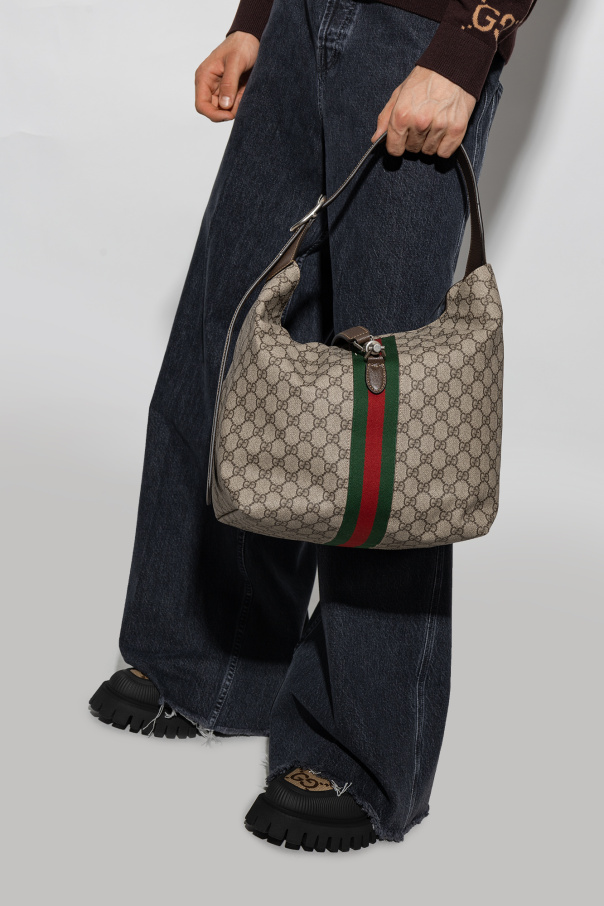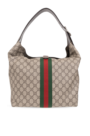 Beige and brown ‘Jackie 1961’ shoulder bag from Gucci. Made of ‘GG Supreme’ canvas finished with leather, this design features a decorative snap closure with an engraved logo, monogram pattern and ‘Web’ stripe in green and red, adjustable shoulder strap, one internal compartment with a detachable snap-fastened pouch and antiqued silver-tone metal hardware.