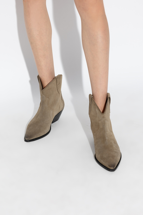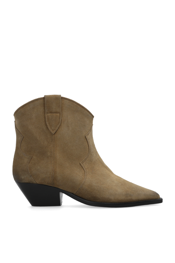 Isabel Marant 米色与绿色'Dewina'高跟踝靴,采用绒面小牛皮制成,采用一脚蹬款式,米色皮革鞋底,尖头和装饰性缝线细节。