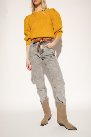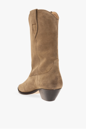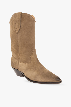Brown ‘Duerto’ heeled ankle boots from Isabel Marant. Made of suede, this slip-on pair features an almond toe, distressed details at the back and leather sole in beige and brown.