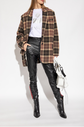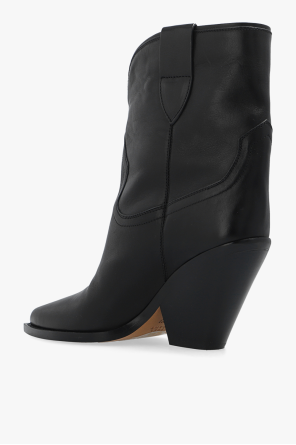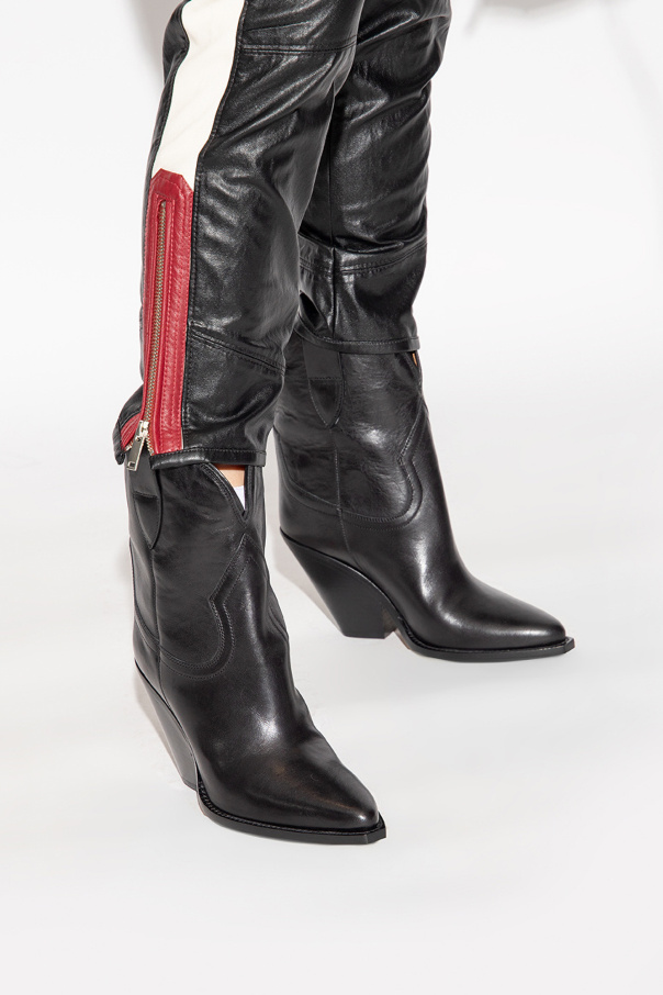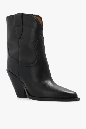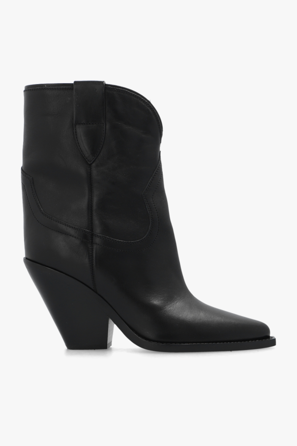 Black ‘Leyane’ heeled ankle boots from Isabel Marant. Crafted from leather with a slip-on silhouette, this model sits on a beige leather sole and features decorative stitching details.