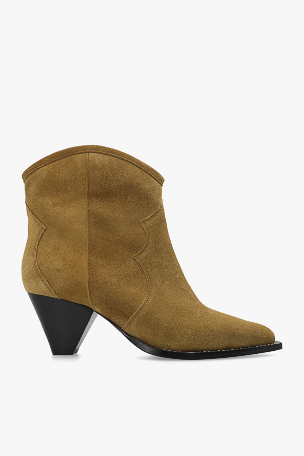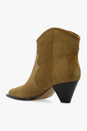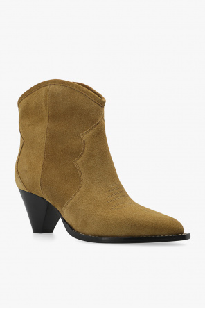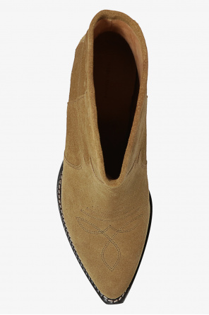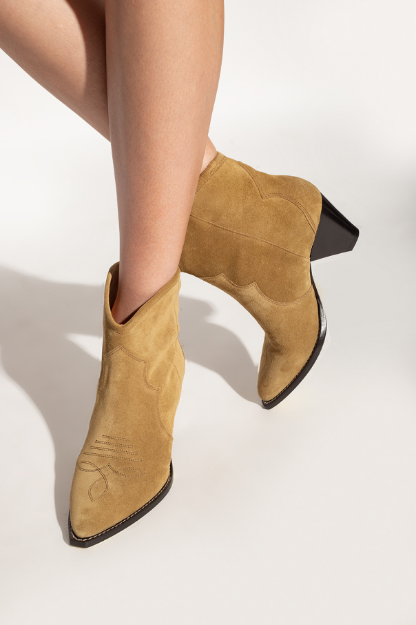Isabel Marant的卡其色'Darizo'高跟踝靴,采用绒面小牛皮制成,穿套式设计,黑色和棕色橡胶鞋底,尖头和外露缝线细节。