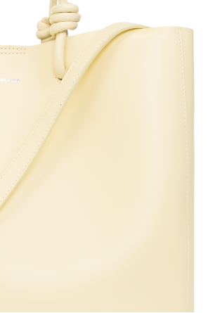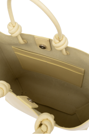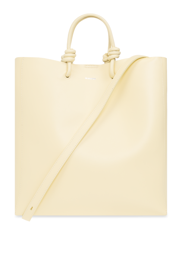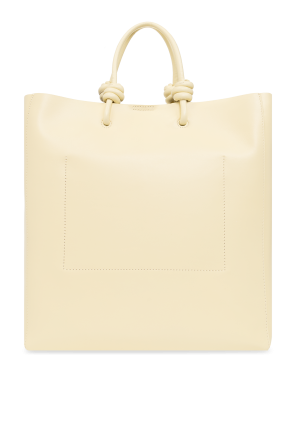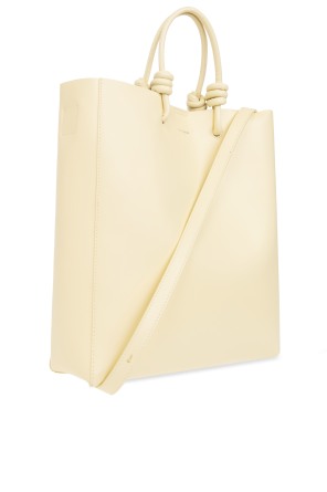 Light yellow shopper bag from Jil Sander. Made of calf leather, this model features a snap closure, a silver-tone logo print, two short handles with decorative knots, a detachable, adjustable shoulder strap, silver-tone metal hardware and one internal compartment with three slip pockets.