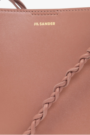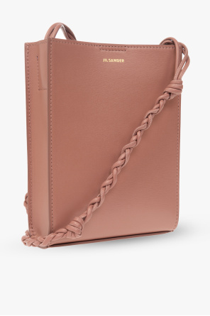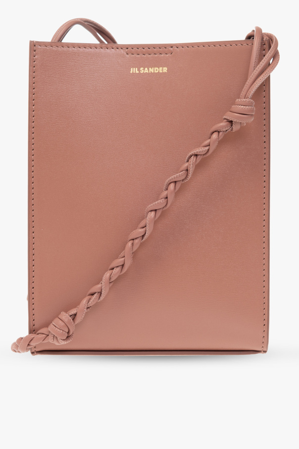 Brownish pink ‘Tangle Small’ phone holder from JIL SANDER. Crafted from leather, this design secures with a magnetic snap and showcases a printed gold-tone logo on the front. It is complete with a hand-woven shoulder strap, gold-tone metal hardware and one internal compartment.