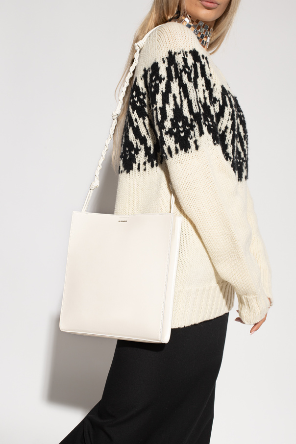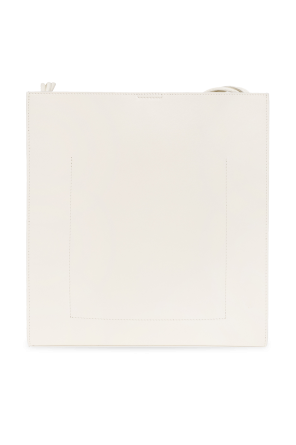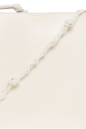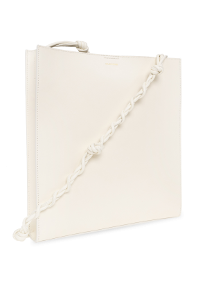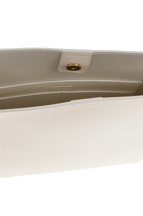 Cream shoulder bag from Jil Sander. Crafted from calf leather, this model features a magnetic snap closure, gold-tone logo print, hand-woven shoulder strap, gold-tone metal hardware and one internal compartment with one slip pocket and two card slots.