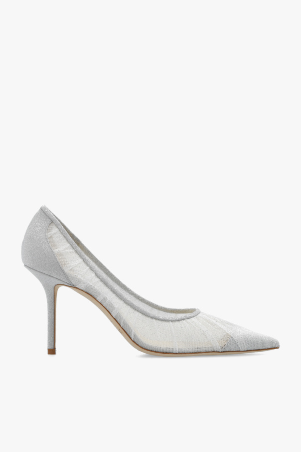 Silver-tone and white ‘Love’ stiletto pumps from Jimmy Choo. Crafted in ruched tulle and spruced up with glitter, this model features a pointed toe and a cream leather sole.