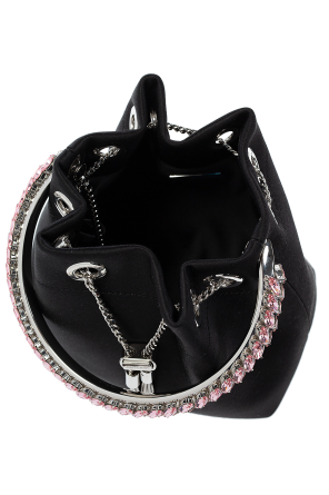 Jimmy Choo的黑色Bon Bon水桶包,由丝绒制成,配有链条抽绳设计、饰有浅粉色水晶的半圆形提手、链条肩带、一个内部隔层和银色金属配件。