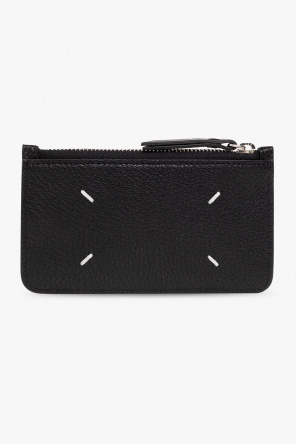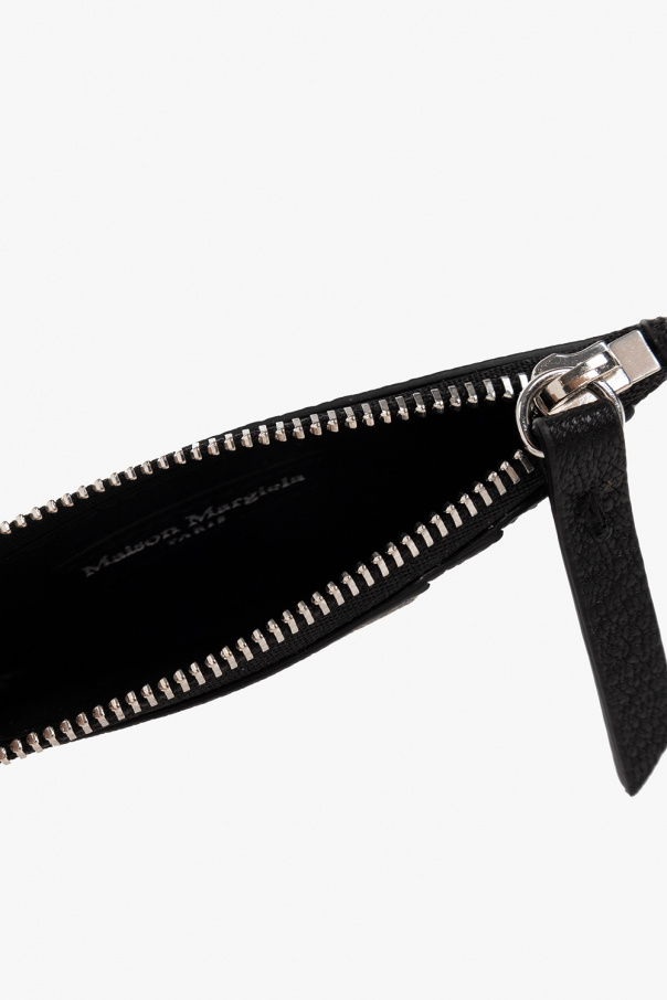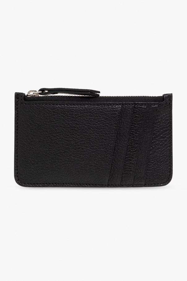 Black card holder from MM6 Maison Margiela. Made of goat leather, this item features white stitching with a logo, four card slots, silver-tone metal hardware and one internal compartment with one zip pocket.