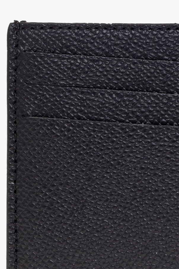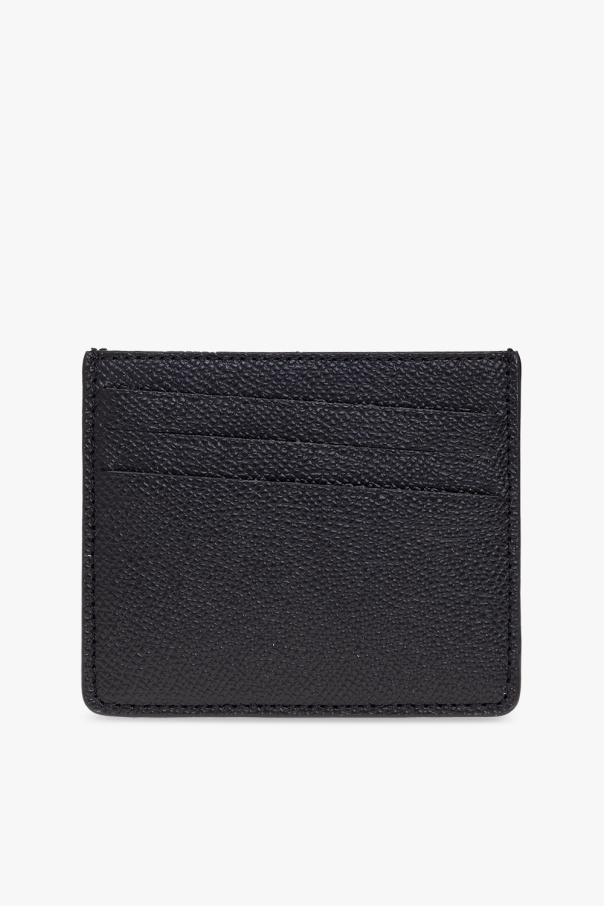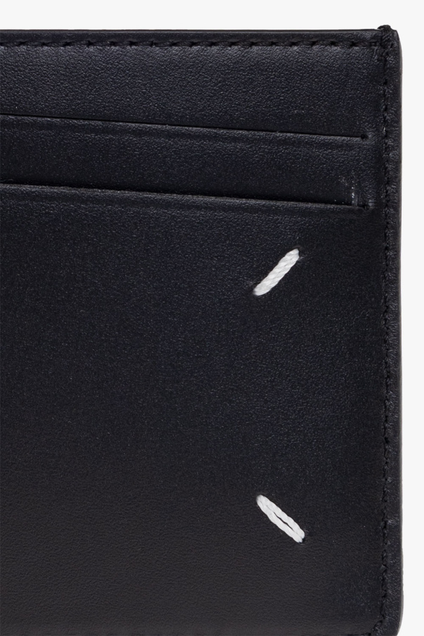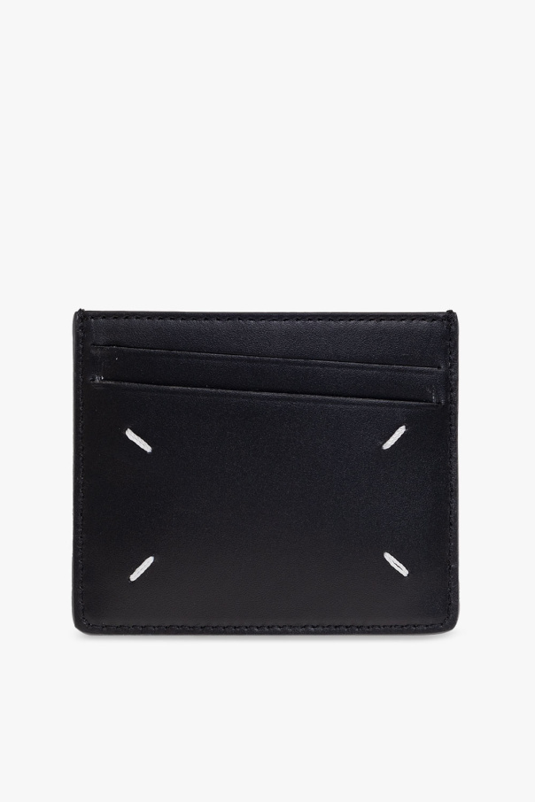 Black card case from Maison Margiela. Made of grained leather on one side and smooth leather on the other, this design showcases the brand's signature white four-stitches moniker and four card slots.
