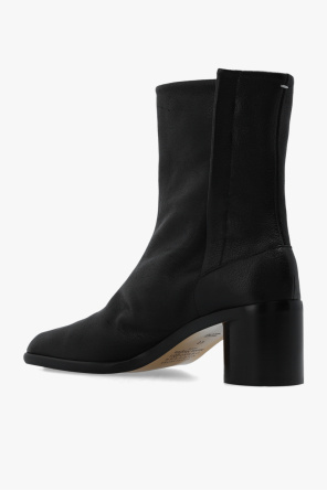 Black heeled ankle boots from Maison Margiela. Made of leather, this pair features hook fastenings with a concealed placket, the brand's signature Tabi split toe and beige leather sole.