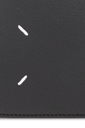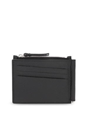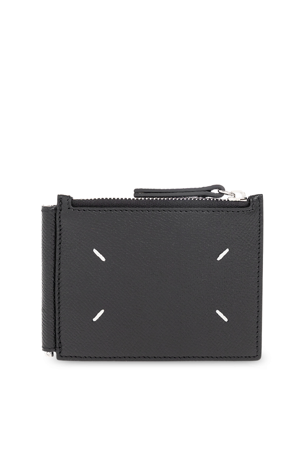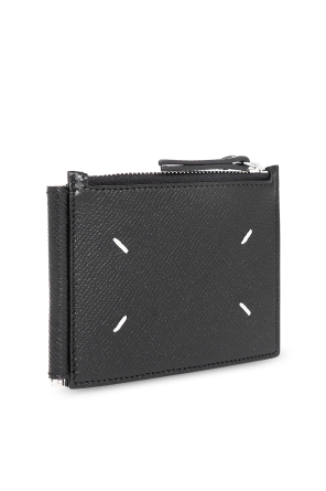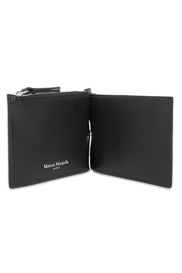 Black wallet from Maison Margiela. Crafted from calf leather, this model features a zipped coin pocket on the front, white logo embroidery, three card slots at the back, internal money clip and silver-tone metal hardware.